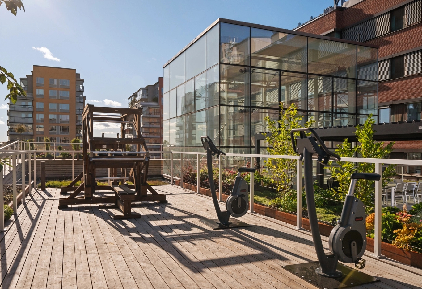 Den levande bottenvåningen med stora glaspartier och gemensamma ytor öppnar upp huset mot omgivningen och skapar naturliga möten. Här ska det vara lätt att leva, mötas och röra sig. Entrén är öppen och rymlig, med plats för både barnvagnar, cyklar och samtal med grannen. I huset finns dessutom en hemtrevlig lounge för alla att mötas. Hit bjuder du in grannarna på aw, förlänger hemmakontoret eller tar med dig kaffet för en avkoppling. Huset erbjuder även gemensam tvättstuga, cykelparkering samt gård med pingisbord.