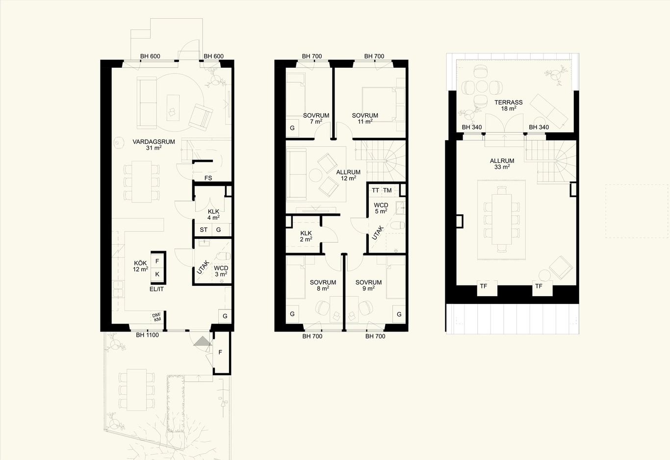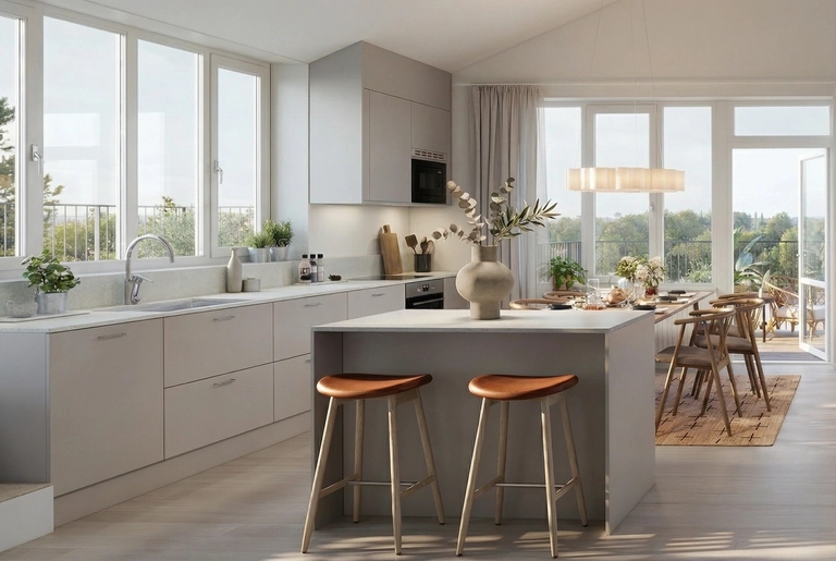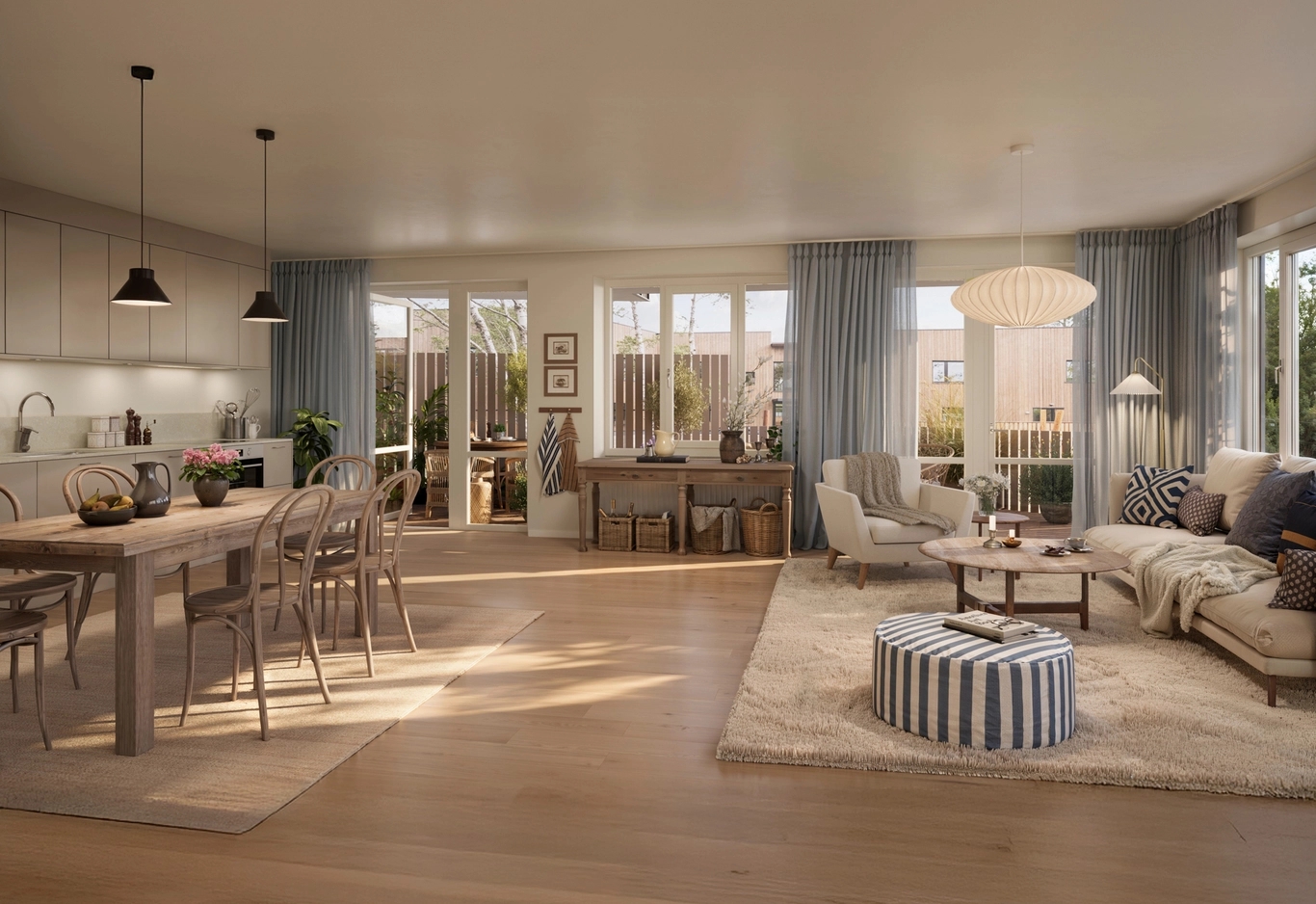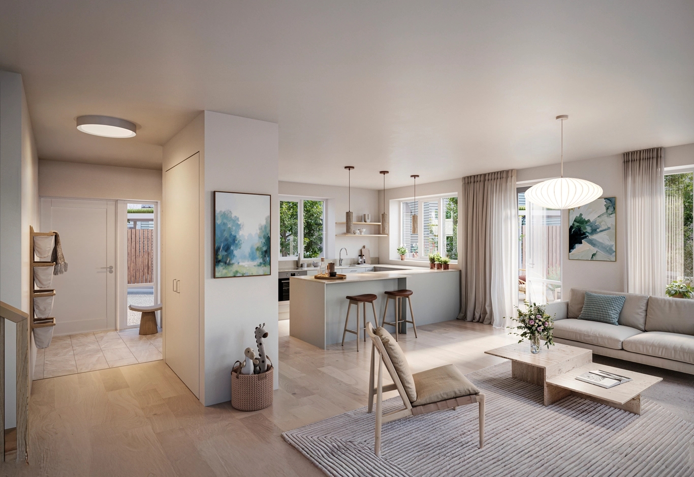 Radhusen erbjuder det marknära boendet som många barnfamiljer längtar efter – med plats för både vardag och gemenskap. Här bor du på två eller tre plan, med mysig kamin i husets hjärta och njuter av havsbrisen på såväl terrass som på uteplatsen. Hemmen har premiumval i både kök och badrum och är utformade för att ge frihet att fokusera på det som verkligen betyder något – gemenskapen, barnen och vardagen – medan föreningen tar hand om det tunga och oväntade. Du slipper tänka på tak, fasader och stora underhållsprojekt, men får ändå känslan av eget hus med trädgård.
