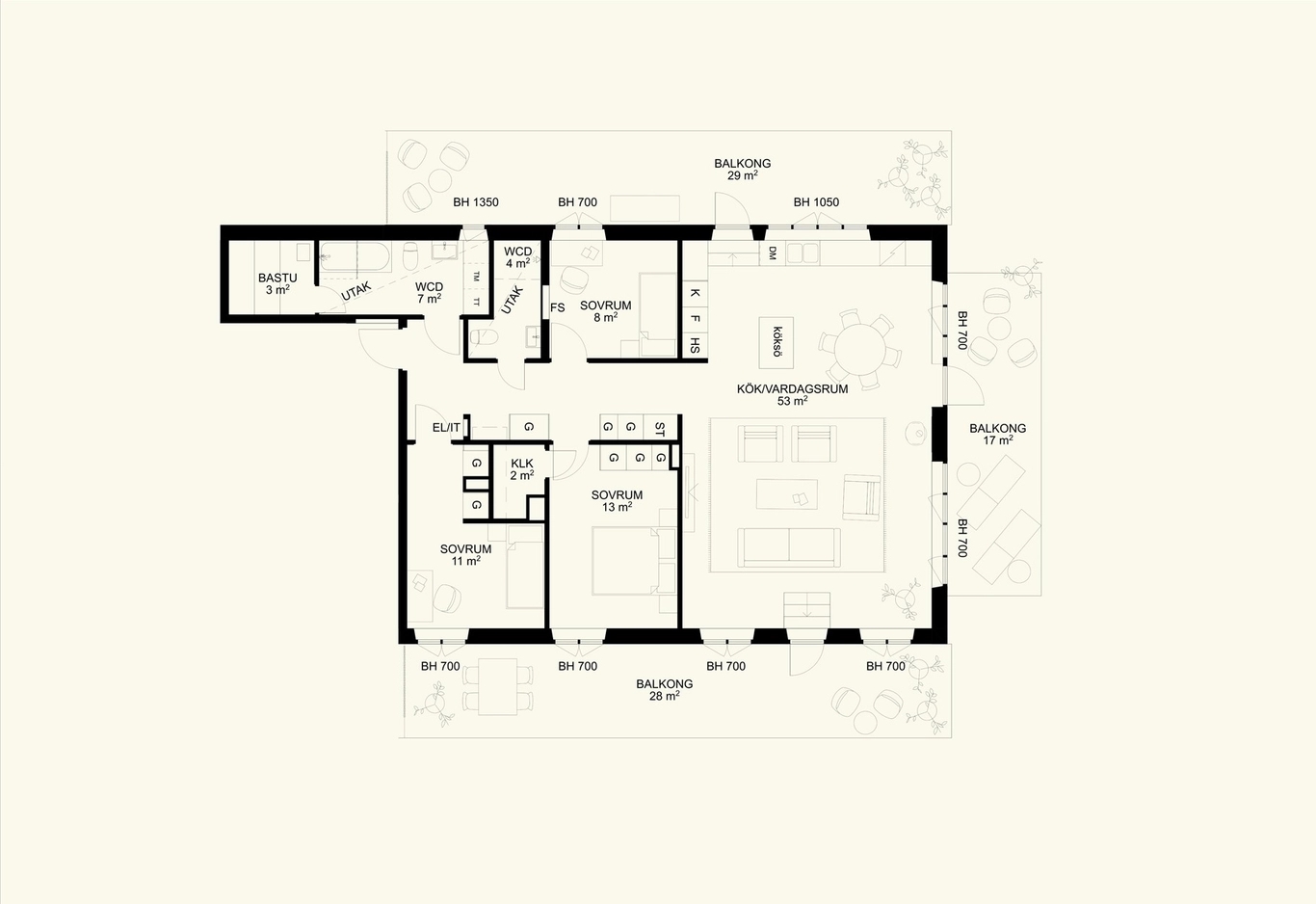 Bostäderna i Höjden är generöst tilltagna och präglas av ljus, rymd, exklusiva materialval och utsikt över skärgården. Här bygger vi hem i olika storlekar, med särskilt fokus på välplanerade 3:or och 4:or. Stora fönster släpper in ljuset och generösa balkonger blir naturliga förlängningar av vardagsrummet, medan de största våningarna högst upp får terrasser i flera väderstreck – perfekt för att fånga både morgon- och kvällsolen. Omsorgsfullt utvalda material skapar en lugn, exklusiv känsla från hall till sovrum.