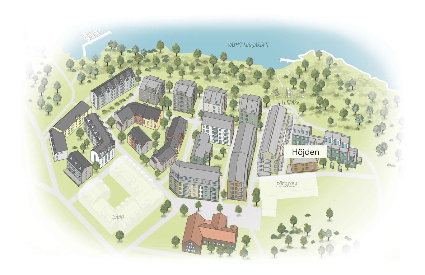I Höjden, såväl som i Norrberget i stort, möts gemenskap och avskildhet i en grön och trivsam miljö. Lummiga gårdar, terrasser med utsikt över Vaxholmsfjärden, lekplats och gångvägar binder samman naturen i norr med stadens puls i söder.