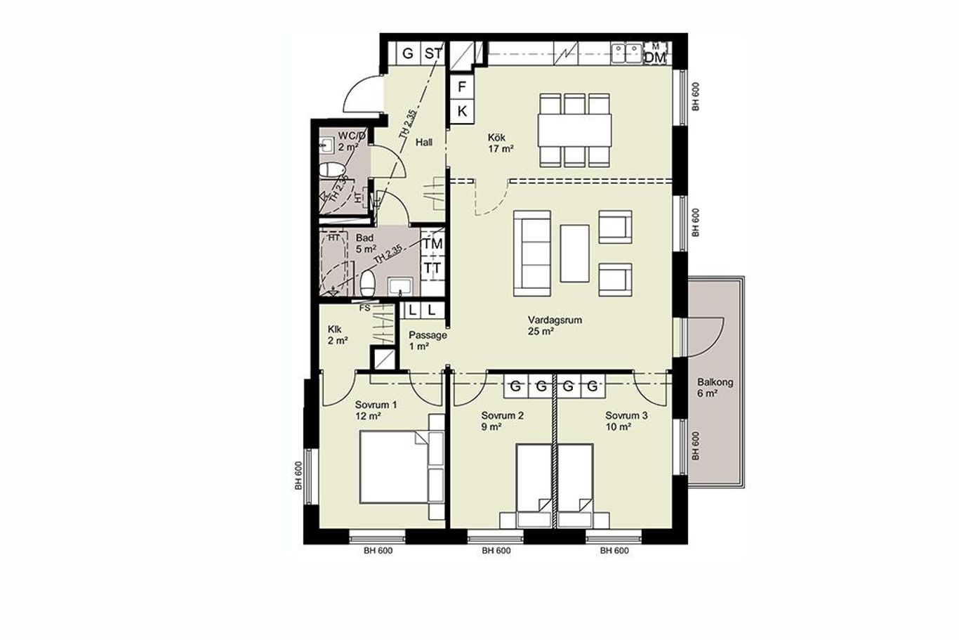 Vidare in i bostaden har du en öppen planlösning mellan kök och vardagsrum, där möjlighet finns att separera köket och vardagsrum med en skiljevägg. Från vardagsrummet tar du dig till en stor balkong med förmiddagssol.