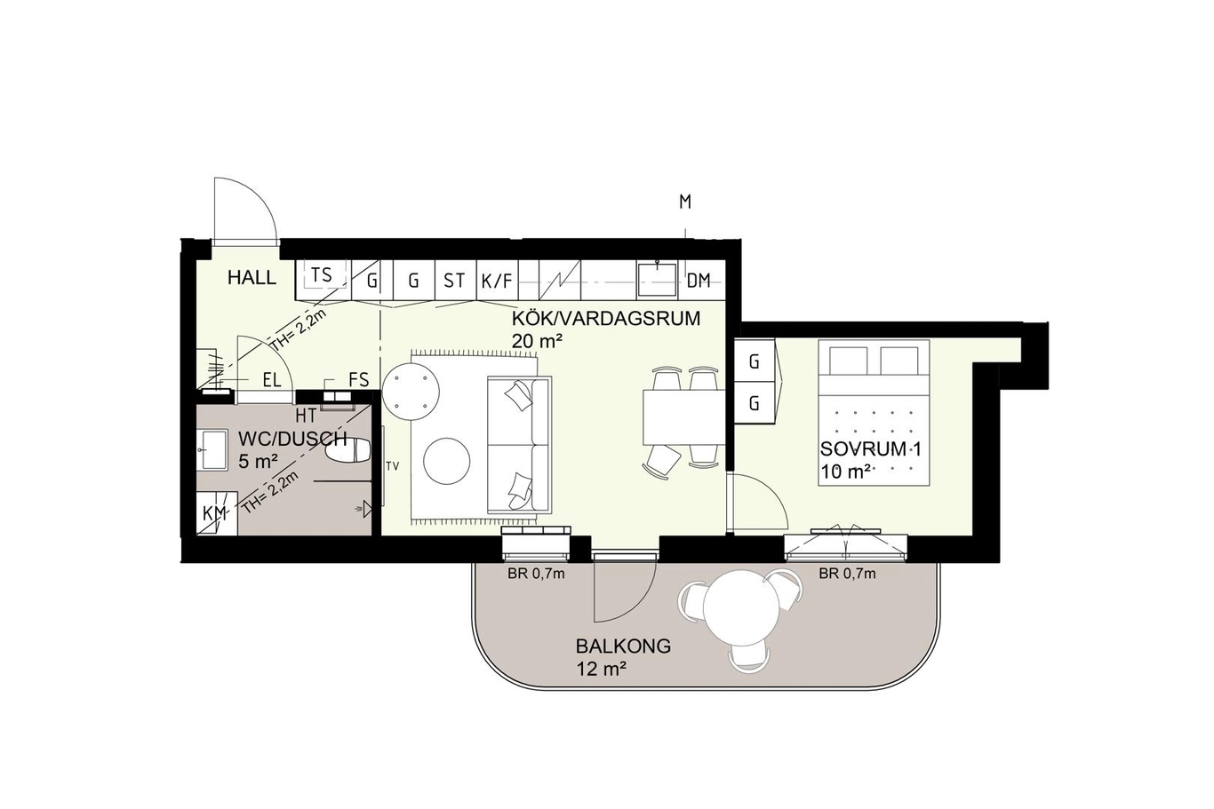 Mycket yteffektiv och social lägenhet om 2 rok samt stor balkong om 12kvm med förmiddags- och dagssol. Kök och vardagsrum med öppen planlösning samt trevligt sovrum.