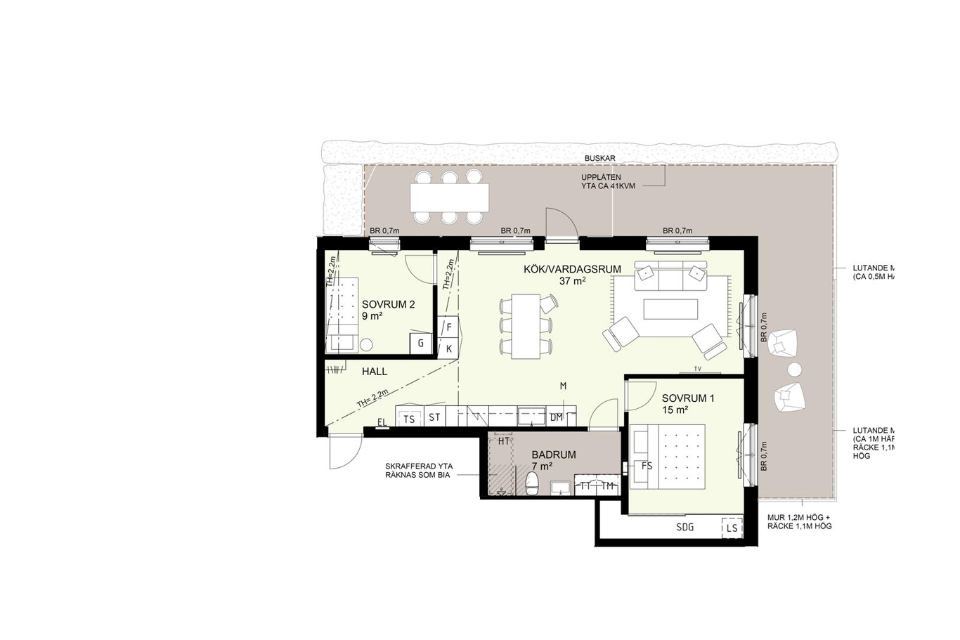 Trivsam trea med dryga 40 kvm uteplats! Kök och vardagsrum i öppen planlösning som erbjuder gott om plats för samvaro. Inredningen går i en varm linnebeige nyans. Köket med släta luckor och rostfria beslag. Vitvarorna är även de rostfria och diskmaskinen integrerad bakom en kökslucka. Köket är från Vedum och vitvarorna från Electrolux.