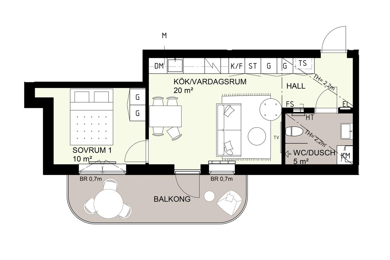 Mycket yteffektiv och social lägenhet om 2 rok med högt läge på fjärde våningen! Stor balkong om 12 kvm med förmiddags- och dagssol.