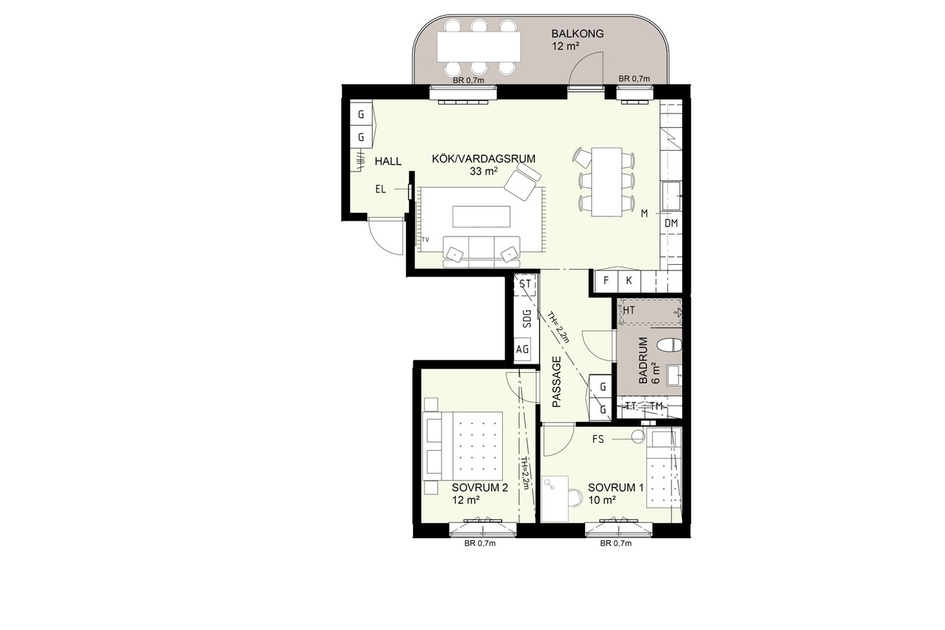 Kök och vardagsrum är öppna mot varandra och skapar ett ljust, luftigt hem med stora ytor. Sovrummen är båda av större modell och ligger i en privat del av hemmet.