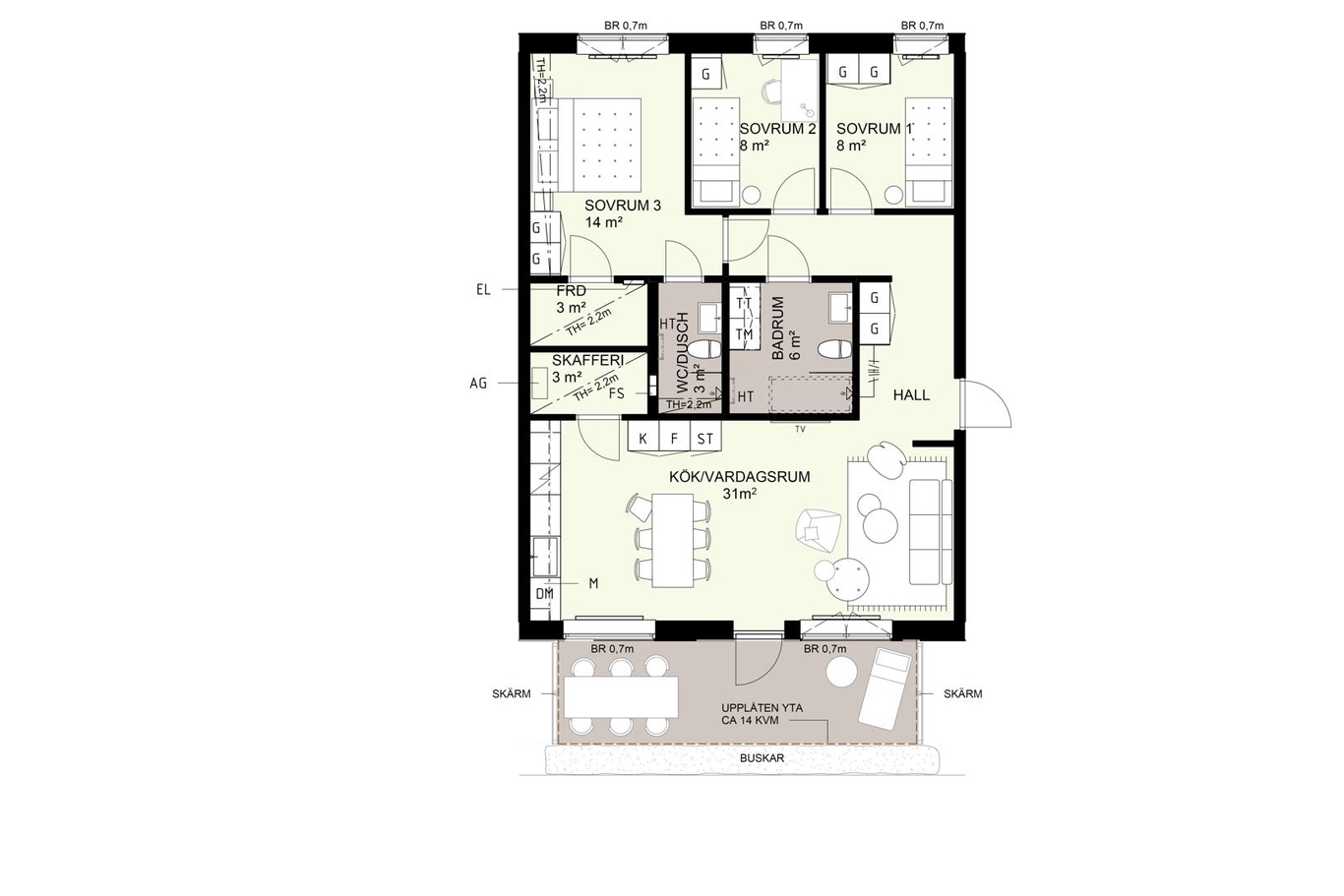 Mycket yteffektiv 4:a med kök och vardagsrum i öppen planlösning samt rejäl uteplats med förmiddag- och dagssol. Avskild sovdel med tre sovrum och två badrum.