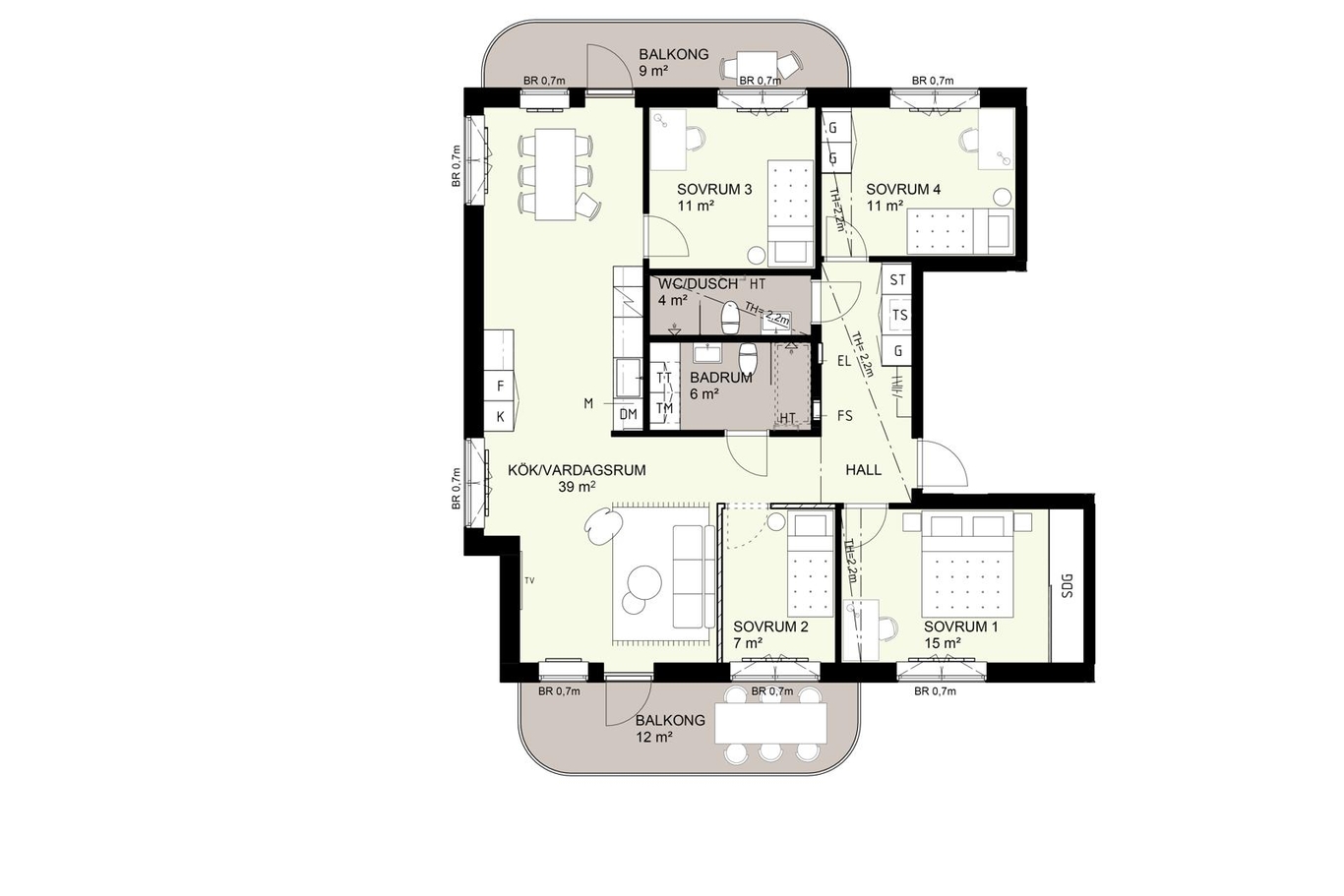 Välplanerad och rymlig 5:a med fönster i tre väderstreck och två generösa balkonger med sol hela dagen. Tre stora, samt ett mindre sovrum. Vill du ha ett extra rymligt vardagsrum så kan du skapa mer yta genom att välja bort det minsta sovrummet. Här blir vardagen också extra bekväm tack vare två separata badrum.