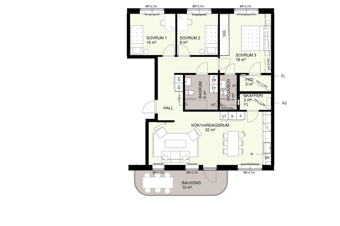 Köket kommer med ett anslutande skafferi, för de som vill ha extra bra överblick av matlagning och hushållning. Rymligt och ljust med öppen planlösning mellan kök och vardagsrum som öppnar upp mot den stora balkongen.