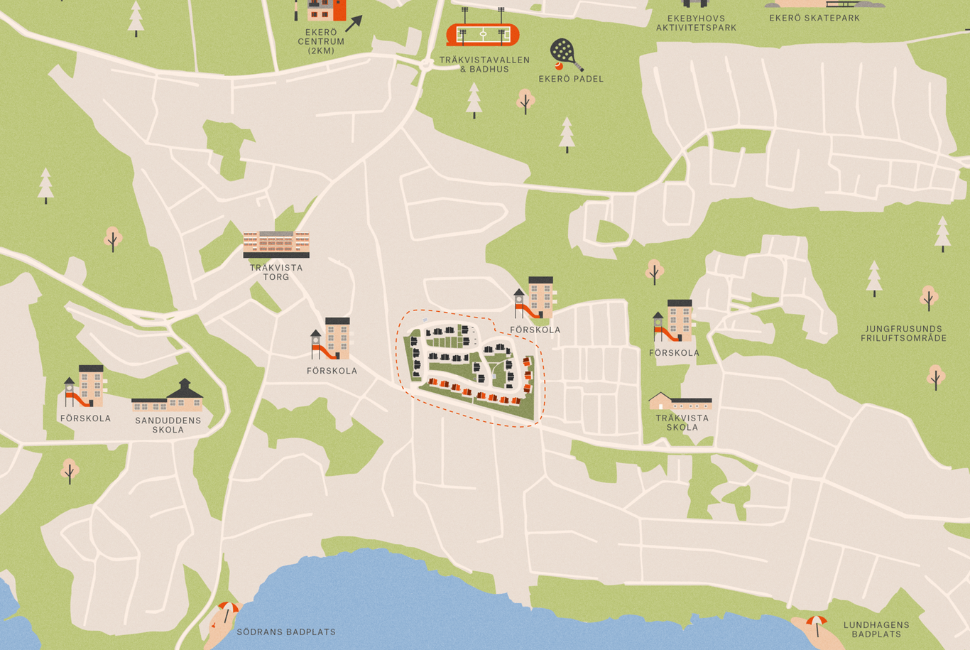 Ekerövallen är en modern trädgårdsstad med massor att erbjuda barnfamiljen! Här bor ni nära Mälarens vatten, med flera skolor, förskolor, mataffärer och idrottsanläggningar inom räckhåll. Dessutom är det bara 20 km in till Stockholm city – ni får det bästa av både närhet till stan och lugn natur!