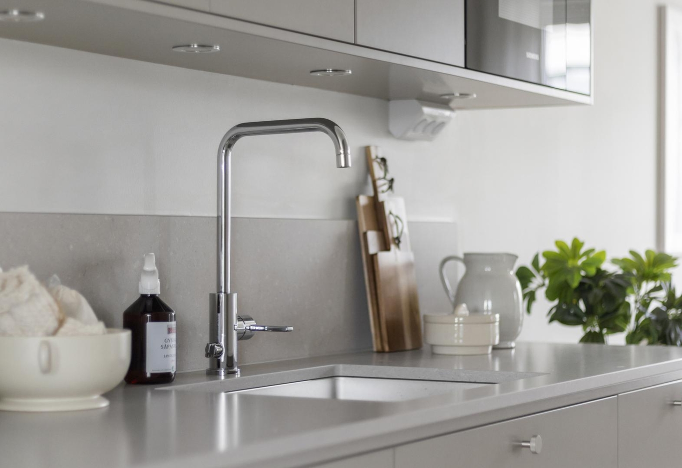 Huset är byggt i trä och harmoniserar med den natursköna omgivningen, och inredningen går i stilren, skandinavisk design med lyxiga material som tål barnens lek och vardagens rörelse – från bakning på köksbänken till leriga stövlar på klinkergolvet i hallen.