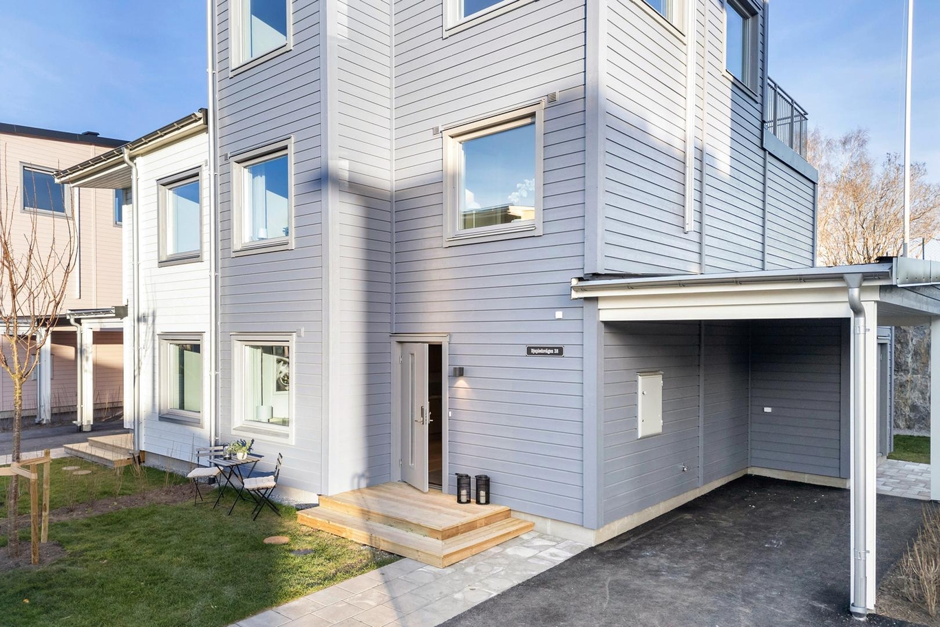 Utanför huset finns en carport med eluttag och plats för fler bilar på uppfarten, perfekt för gäster eller för barnens cyklar. Nära hemmet ligger allt ni behöver: mataffärer, restauranger, gym, frisör, och framför allt – flera förskolor och skolor.