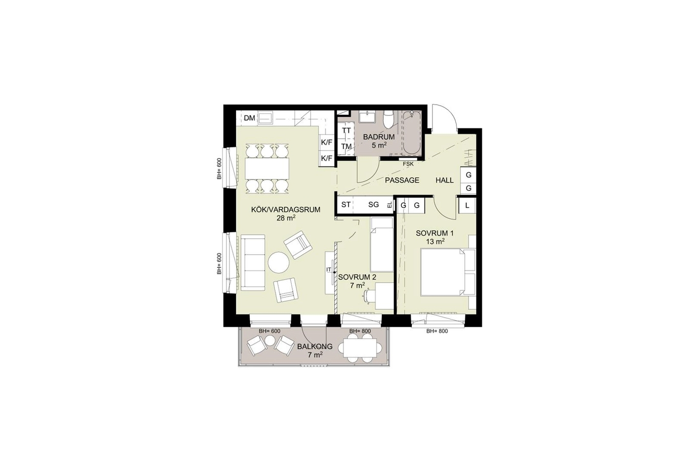 Köket håller en hög standard och har väl planerade arbetsytor och gott om förvaringsmöjligheter. Spis med induktionshäll samt diskmaskin ingår som standard. Det större sovrummet är utrustat med garderober.