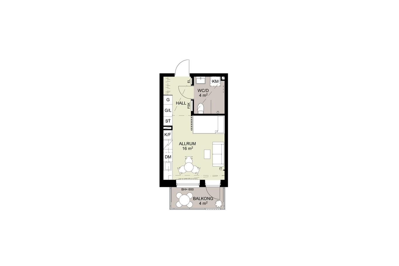 Mysig etta högt upp med balkong om cirka 5 kvm och kvällssol. Hall med garderobsförvaring och plats för avhängning. Från hallen nås ett rymligt badrum utrustat med tvättmaskin och torktumlare. Rum med öppen planlösning mot fullt utrustat kök samt praktisk sovalkov. Härifrån nås även den stora balkongen.
