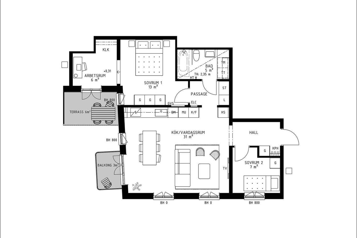 Härliga sociala ytor i ett öppet kök/vardagsrum med hörnläge i fastigheten samt utgång via dubbeldörrar till lägenhetens balkong. Stort sovrum med intilliggande arbetsrum samt utgång till terrass om ca 6 kvm där man gärna tar morgonkaffet. Badrum/WC med dusch, tvättmaskin och torktumlare.