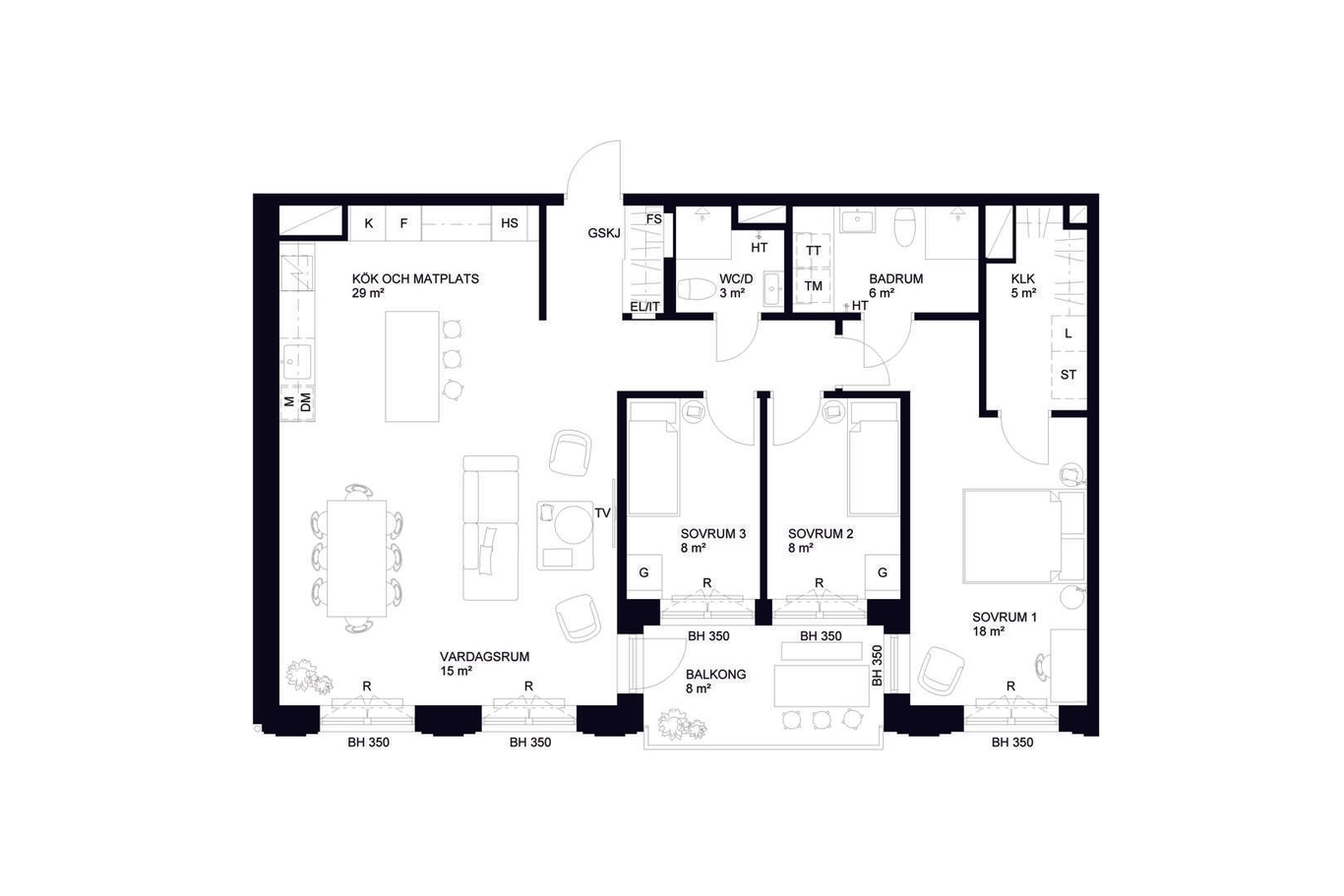 En rymlig och välplanerad fyra med ett stort och inbjudande kök och vardagsrum i öppen planlösning. Köket blir lätt hemmets mittpunkt och här finns en stor köksö att samlas kring för matlagning, samtal och måltider. Det finns också plats för soffgrupp och stort matbord som kan rymma båda familj och vänner till middag. Från vardagsrummet nås även den mysiga balkongen, djupet på balkongen gör den lätt att möblera. De tre sovrummen ligger i lägenhetens mer privata del, där det lyxiga master bedroom har eget badrum och klädkammare. Lägenhetens andra badrum ligger i anslutning till hallen.