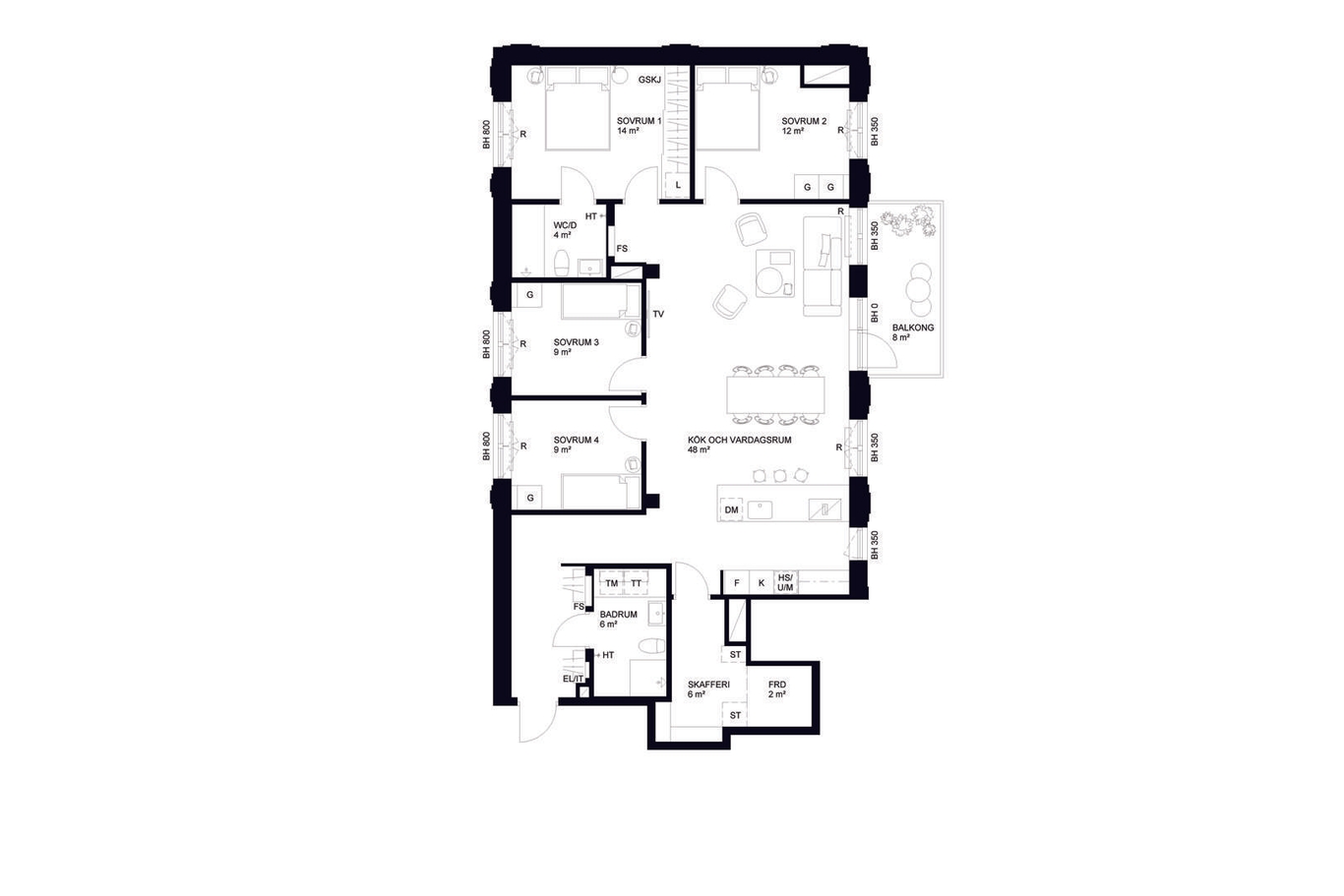 En riktigt härlig familjelägenhet med många fina kvaliteter och detaljer. Vad sägs om fyra rymliga sovrum, där det största har eget badrum och en hel garderobsvägg bakom skjutdörrar. Ett stort och rymligt kök och vardagsrum med plats för stort matbord och soffgrupp som rymmer hela familjen. Rummet får fin karaktär av de lågt bröstade fönstren som har utsikt mot föreningens mysiga innergård, härifrån når man också lägenhetens balkong. Köket har en fin planering med en stor köksö där även spishällen är placerad, så här kan man stå vänd mot övriga familjen samtidigt som maten lagas. I direkt anslutning till köket finns också ett skafferi, en praktisk och lyxig lösning för allt det där man behöver men inte vill ha framme. I anslutning till hallen finns lägenhetens större badrum som är bekvämt utrustat med egen tvättmaskin och torktumlare.