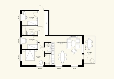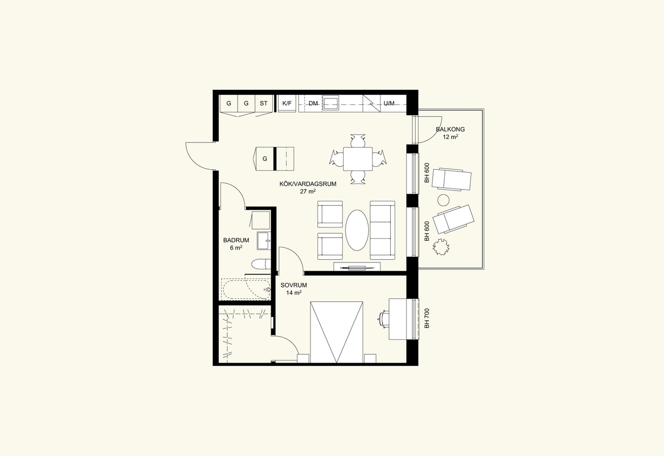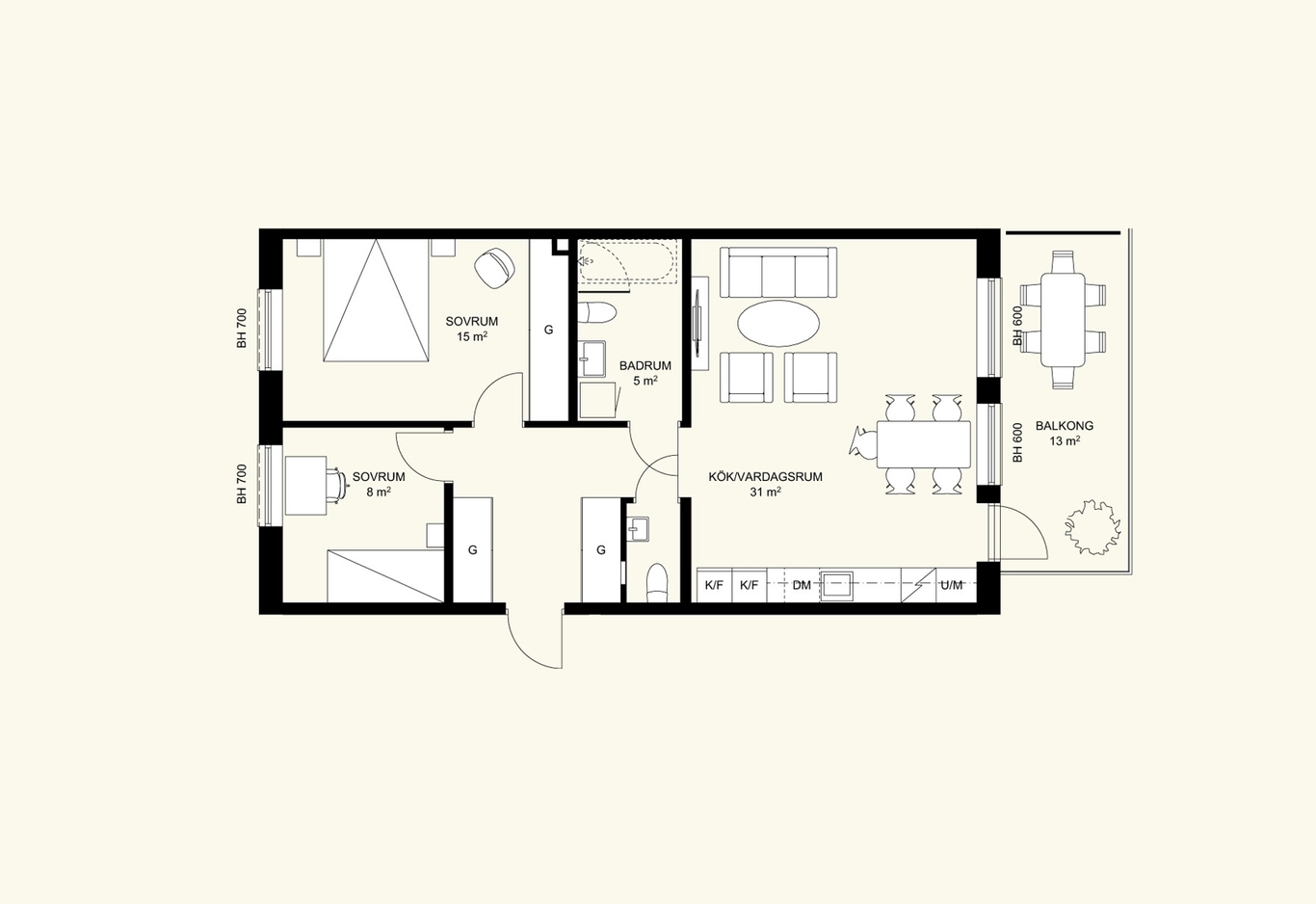 Balkongerna löper längs fasaderna, så att varje lägenhet får kontakt med grönskan och ljuset. Eftersom platsen ligger högt och öppet var det viktigt att planlösningarna gav både rymd och flexibilitet. Vi tänkte på hur man faktiskt lever – familj, arbete, vila – och ritade bostäder som rymmer alla de delarna utan att tappa lugnet. Lägenheterna är ljusa, med tydliga siktlinjer och naturligt flöde mellan rummen. Jag har ritat planer med en balans mellan rymd och proportion, för att möjliggöra långsiktig lösning som klarar boendeförändringar.