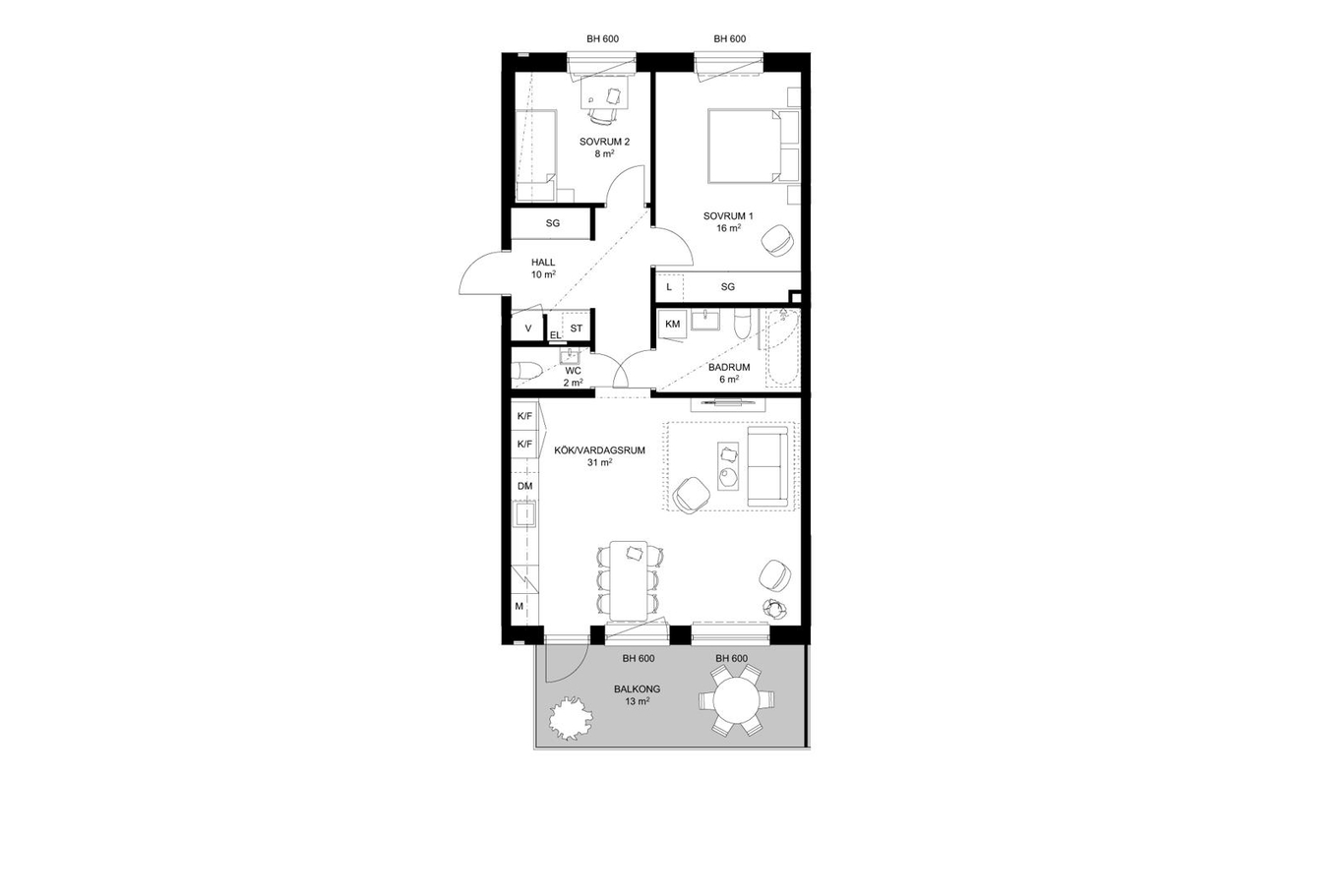 Här erbjuds en luftig lägenhet med fint samband mellan kök och vardagsrum. Härifrån nås den generösa balkongen om 13 kvm i soligt söderläge. Gott om förvaringsmöjligheter i skjutdörrsgarderober, rymligt badrum med kombimaskin och extra wc förenklar vardagen.