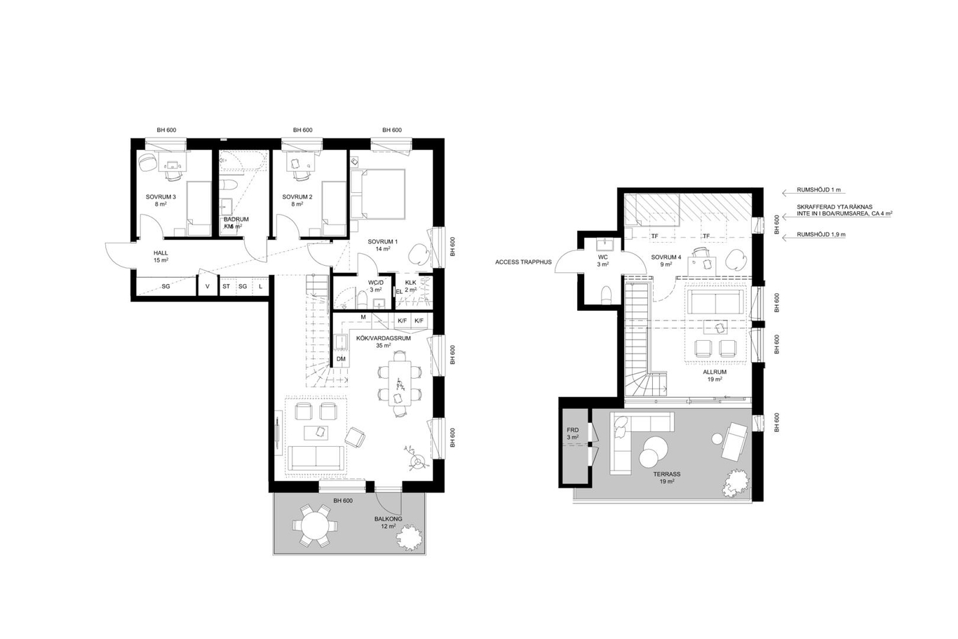 Bostaden erbjuder fyra sovrum, varav ett master bedroom i hörnläge med eget badrum och klädkammare och ett sovrum på övre plan med takfönster och egen WC. Här kan du välja bort väggen för att skapa ett stort extra vardagsrum med fönster i tre väderstreck.
