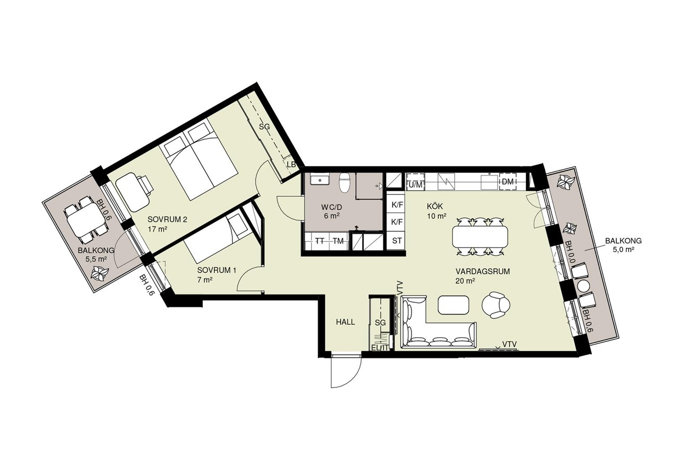 | 11-1602 | 6 | 2 rok | 51 kvm | 6 295 000 kr | 4 135 kr | Till salu |