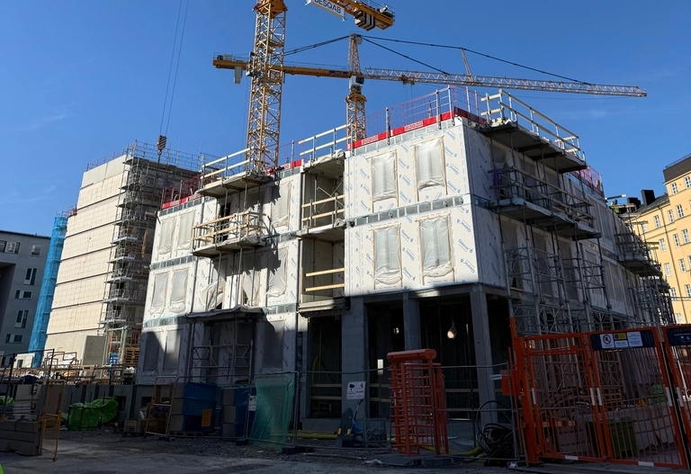 Just nu befinner vi oss främst i fasen där byggnadens grundstomme sätts upp. Garaget och källaren är klara, och vi har rest stommen till och med våning 2 i trapphus 3 och 4.Nu fortsätter arbetet med att bygga stommen i trapphus 1 och 2. Inom kort kommer vi också att gjuta bjälklaget (golvet mellan våningarna) där, så att vi kan fortsätta bygga vidare uppåt i huset.