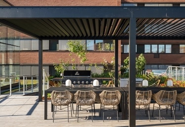 Den levande bottenvåningen med stora glaspartier och gemensamma ytor öppnar upp huset mot omgivningen och skapar naturliga möten. Här ska det vara lätt att leva, mötas och röra sig. Entrén är öppen och rymlig, med plats för både barnvagnar, cyklar och samtal med grannen. I huset finns dessutom en hemtrevlig lounge för alla att mötas. Hit bjuder du in grannarna på aw, förlänger hemmakontoret eller tar med dig kaffet för en avkoppling. Huset erbjuder även gemensam tvättstuga, cykelparkering samt gård med pingisbord.