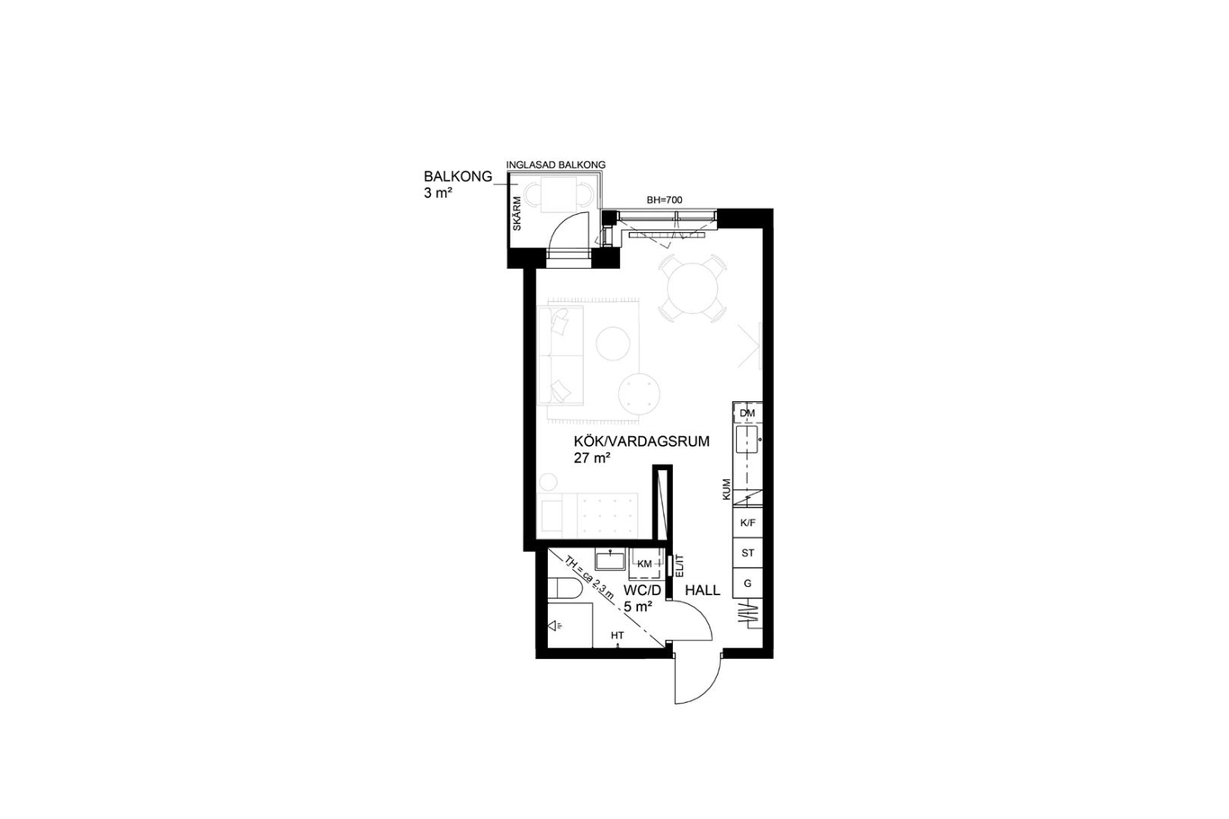Lägenheten har en alkov som ger dig en separat plats för sängen, ett rymligt rum där du kan ha både matplats och soffa, och en mindre balkong för möjlighet att öppna upp och sitta ute.
