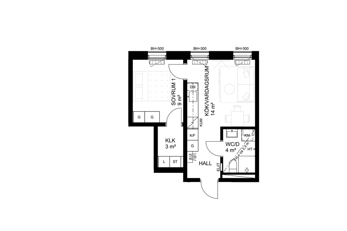 Rummet kan möbleras med såväl matgrupp som soffa och köket är bekvämt utrustat med diskmaskin och kombiugn som har funktion av både ugn och micro. Sovrummet har plats för en dubbelsäng och med både garderober och klädkammare kan man stuva undan kläder och annat smått. I badrummet finns en egen kombimaskin för tvätten.