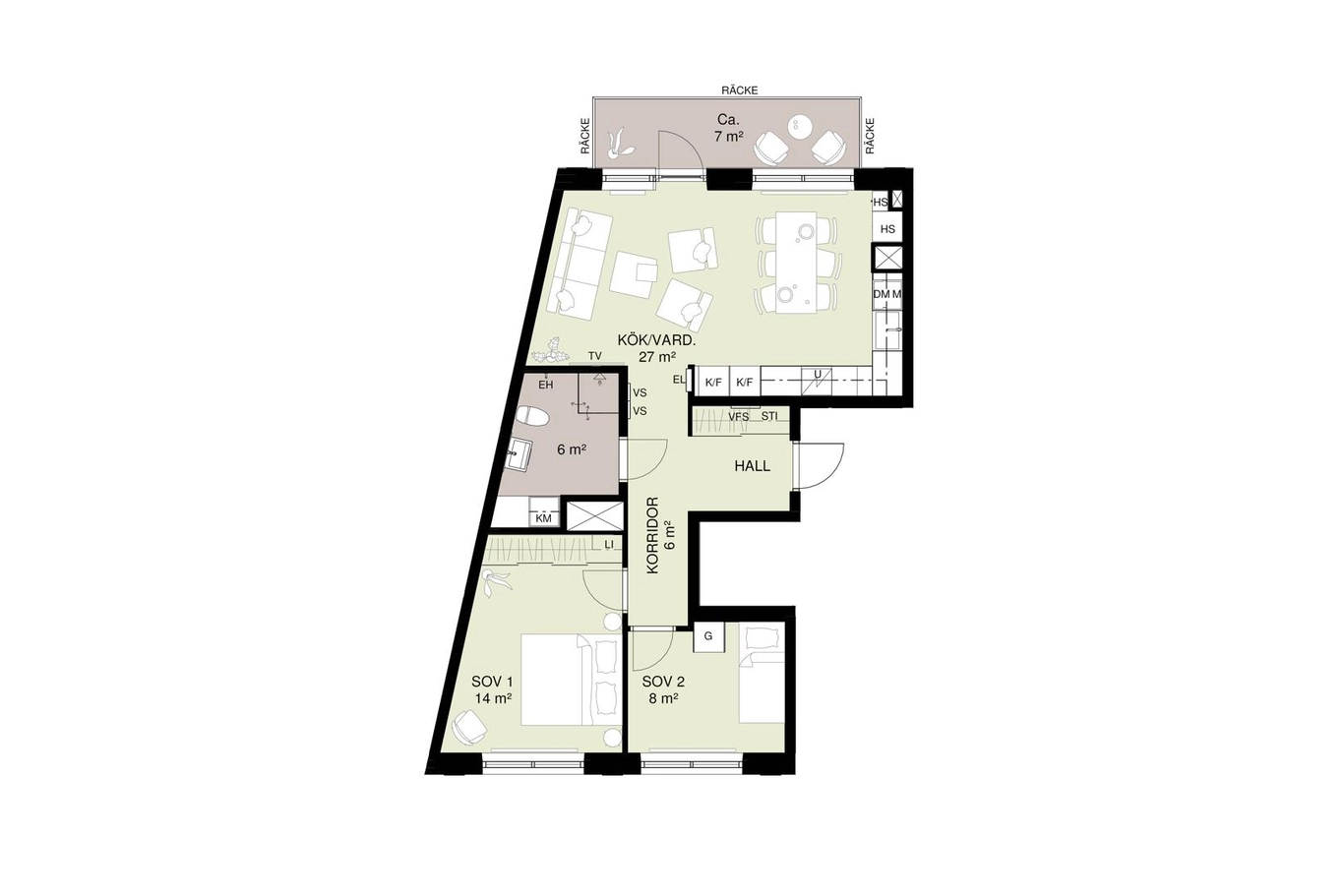 Denna lägenhet är designad för att maximera både ljusinsläpp och funktionalitet. Det öppna köket och vardagsrummet bjuder in till umgänge, medan sovrummen är placerade för optimal avskildhet och ro.