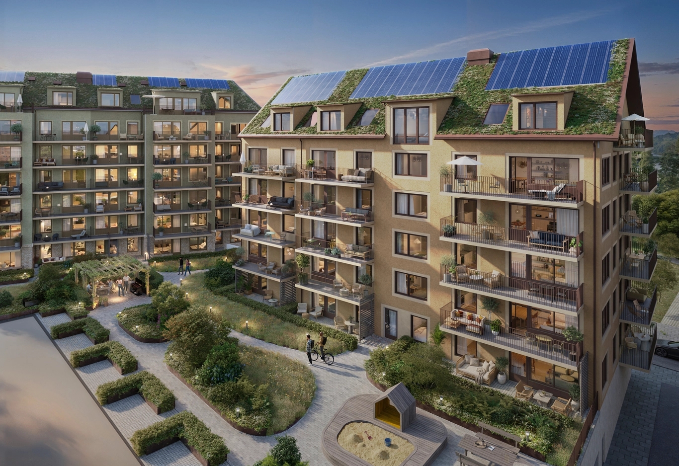 I mitten av kvarteret ligger den gröna innergården; en lugn, skyddad plats som samtidigt öppnar sig mot vattnet. Färgskalan och bebyggelsen runt omkring ger gården en trygg och välkomnande känsla.