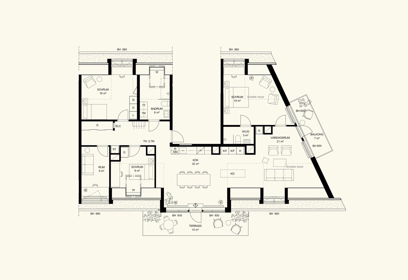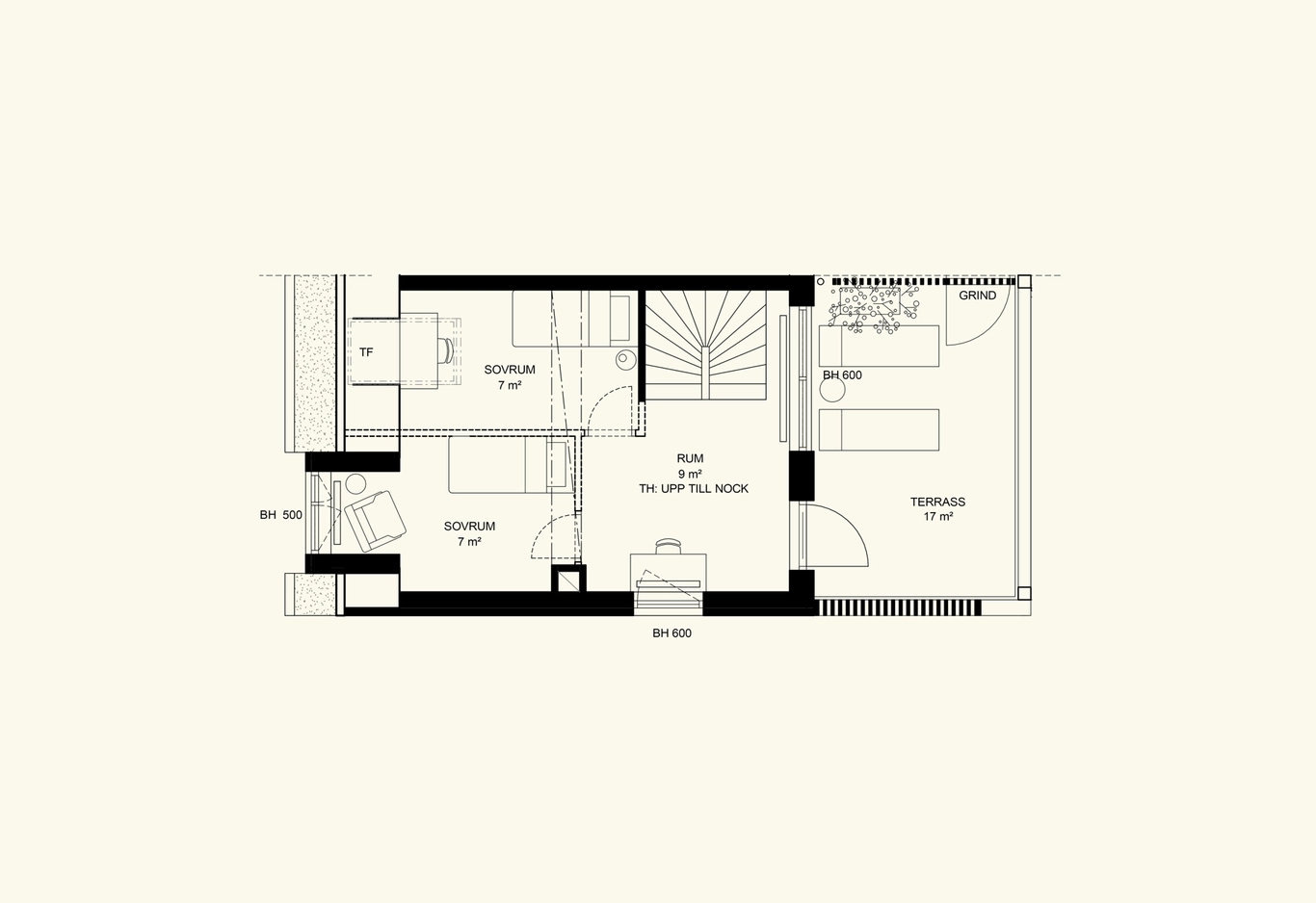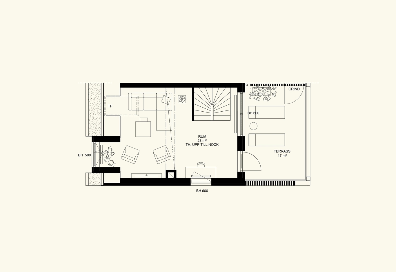 Vi har föreställt oss ett avslappnat trädgårdsnära boende där man följer trädgårdens skiftningar och trivs att vistas ute. Inspirationen kommer från en trädgårdstradition med mjuka former, sinnlighet och rikt växtinnehåll där mötet mellan stramt och fritt uppskattas.