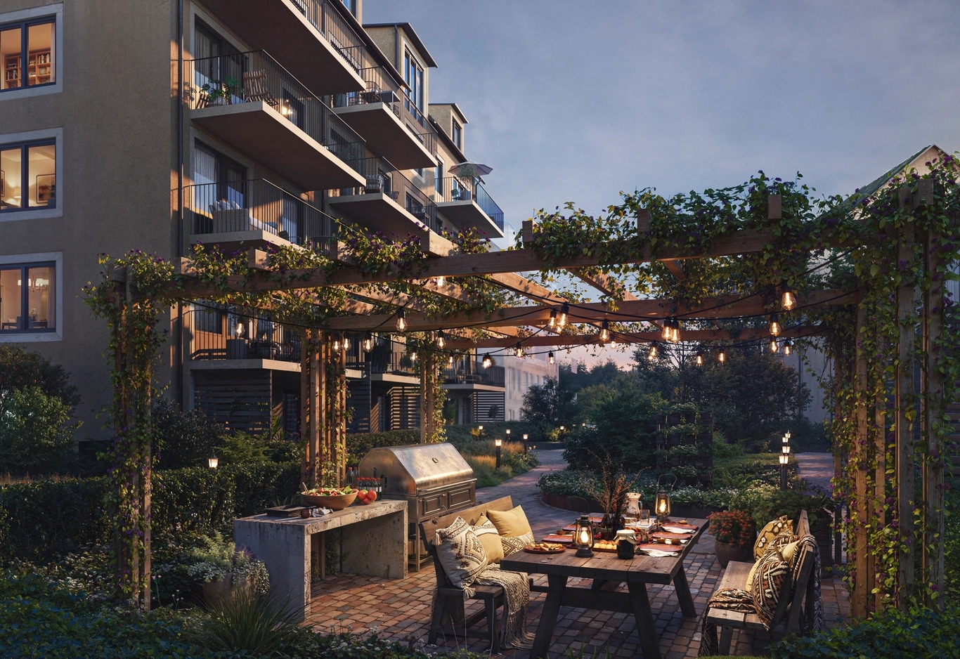 Tillsammans skapar planlösningarna, materialvalen och gårdsmiljön en känsla av att bo på en plats där livet får vara enkelt. Där det är nära till naturen och nära till det som gör vardagen lite lättare och mycket mer meningsfull.