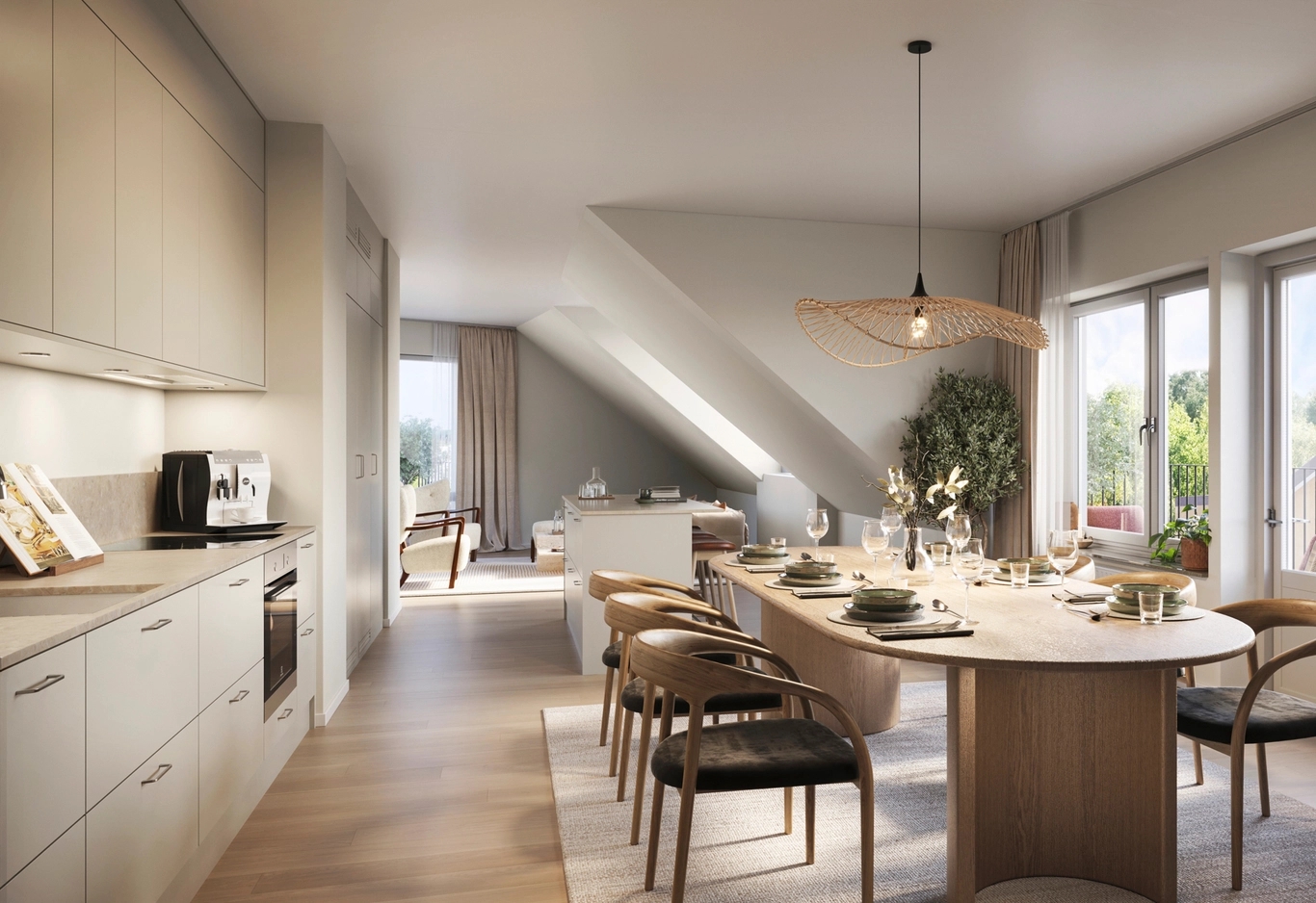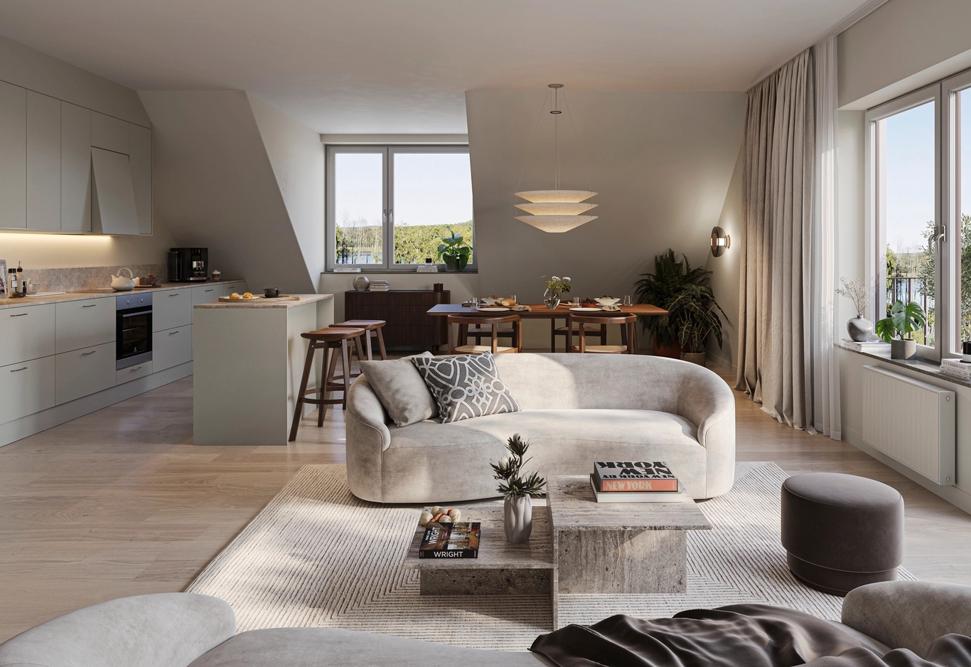Öppna planlösningar, smart placerade fönster och generösa sociala ytor gör det lätt att umgås, laga mat ihop eller, om du önskar, få en stund för dig själv. Materialvalen är valda med omsorg och innehåller mjuka kulörer, hållbara ytor och detaljer som gör att hemmet håller över tid. Ett hem som känns bra från första dagen och som fortsätter kännas bra många år framöver.