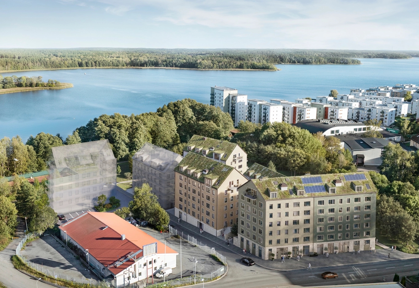 Uppdraget var att skapa ett avslappnat boende nära vatten och natur, men med stadsmässiga kvaliteter. Det vattennära läget och den varierade skalan, med högre bostadshus och lägre radhus, gav projektet sin karaktär. De uttrycksfulla taken och inspirationen från både klassiska stadsmiljöer och trädgårdsstadens mjukare uttryck skapar en silhuett som känns både tidlös och samtida.