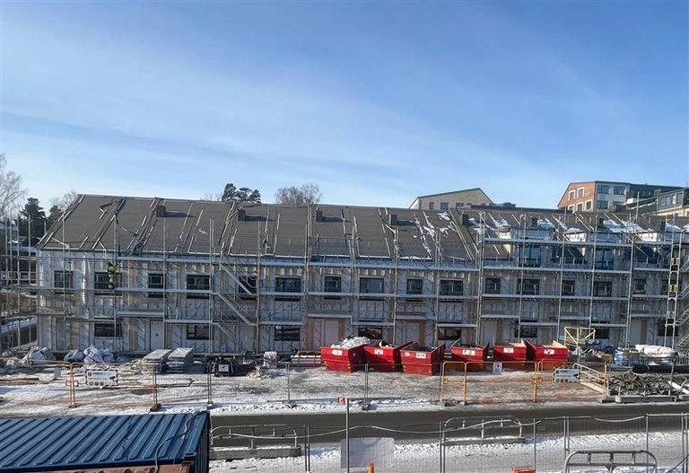 Arbetet med att resa stommarna för hus 10–15 är nu i full gång. Denna första huslänga beräknas vara klar i början av december. Efter det fortsätter vi med stomresningen av hus 1–9. Under januari kommer samtliga hus vara på plats och området börjar ta sin slutliga form. Samtidigt påbörjar vi det invändiga arbetet, där vi bygger innerväggar, installerar el, ventilation och andra ledningar samt lägger golv. Till våren startar vi arbetet med att putsa fasaderna och montera träpanelen.