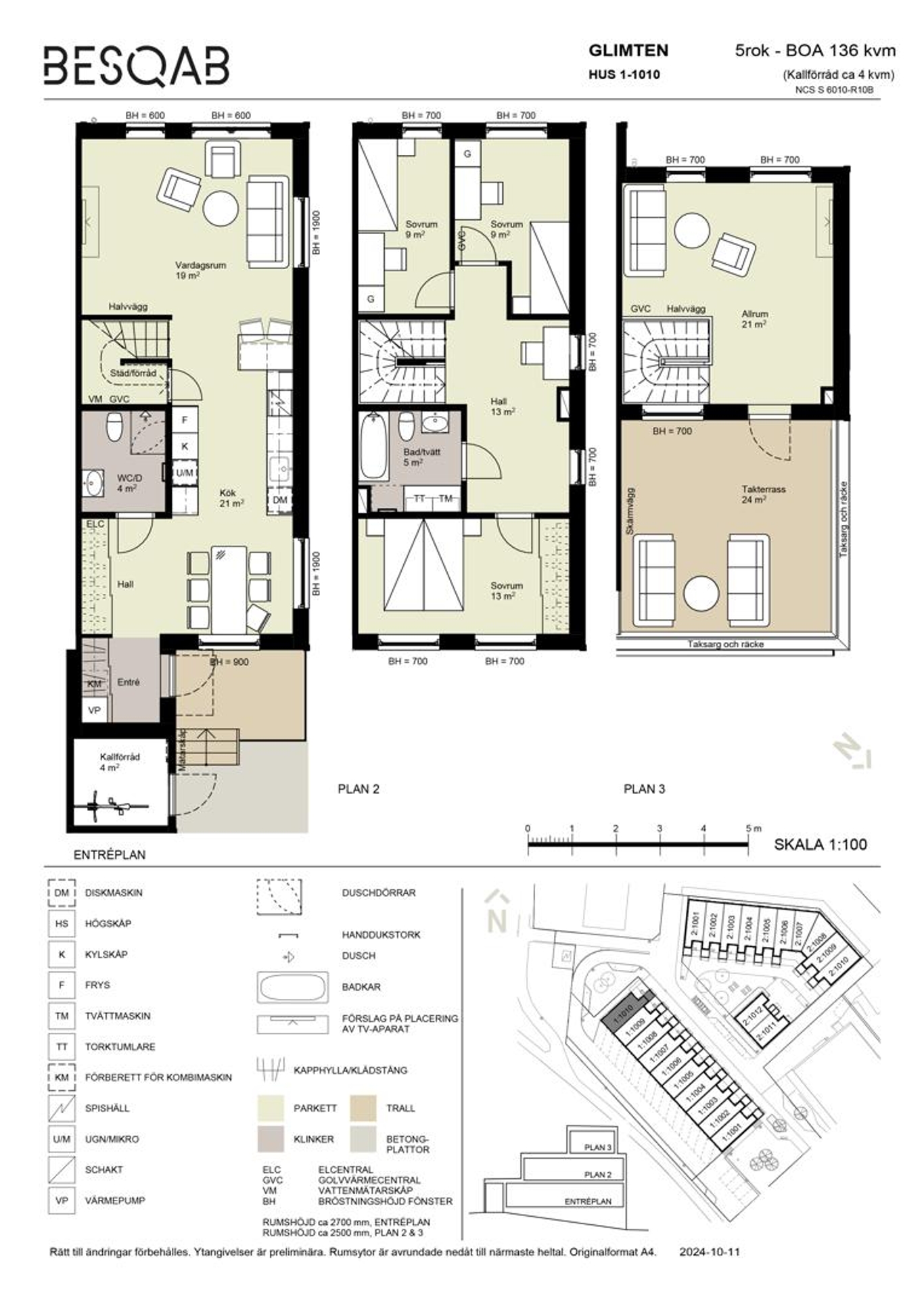 På tredje våningen finns ett mycket rymligt allrum (som även går att avdela till ytterligare ett till två sovrum). Här finns även utgången till husets takterrass om hela 24 kvm med ett läge som badar i sol. Hela detta våningsplan har vattenburen golvvärme, samt en rumshöjd om ca 250 cm.