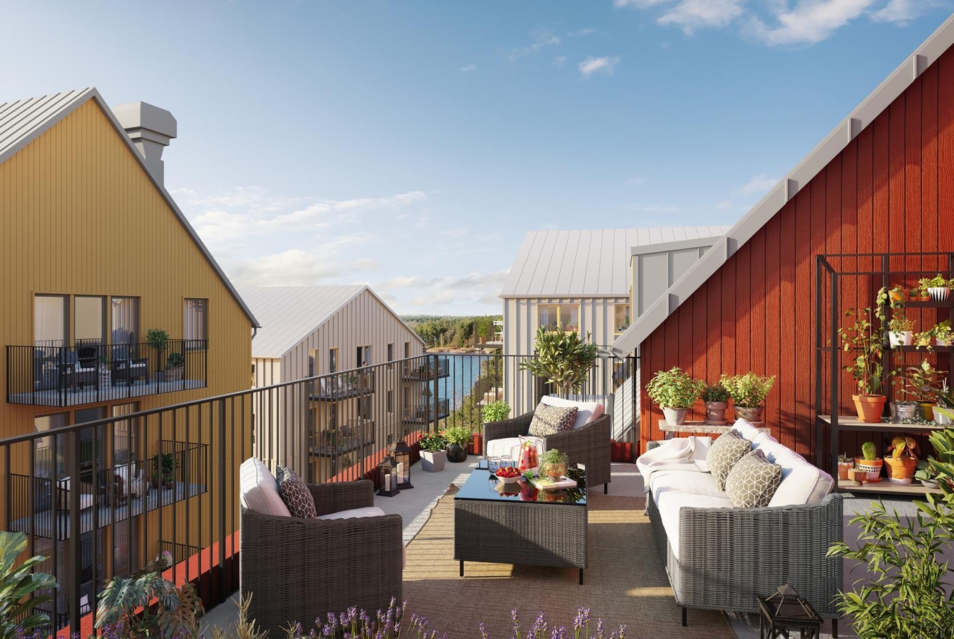 - Takterrass om 40 kvm i västerläge med sjökontakt mellan grannhusen
