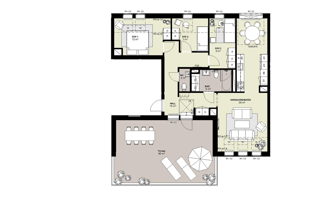 En av områdets mest unika taklägenheter, med en fantastisk takterrass om hela 40 kvm i västerläge – den perfekta platsen för dig som älskar att vistas utomhus och njuta av kvällssolen. Här kan du skapa din egen oas och verkligen maximera utelivet. Lägenheten har en genomtänkt planlösning där funktion och privatliv harmoniserar. Sovavdelningen är avskild för extra lugn och ro, medan köket ger dig möjlighet att laga mat ostört med generösa arbetsytor på ena sidan. På motsatt sida har du allt inom räckhåll – kyl, frys och ett rymligt skafferi. Vid fönstret finns utrymme för ett stort matbord, perfekt för härliga middagar med vänner och familj. Vardagsrummet bjuder in till avkoppling och socialt umgänge, medan resten av hemmet skapar en behaglig balans mellan privat och öppet. Ett unikt boende för dig som söker något extra. Alternativ planlösning finns för dig som önskar större matsal i anslutning till köket.