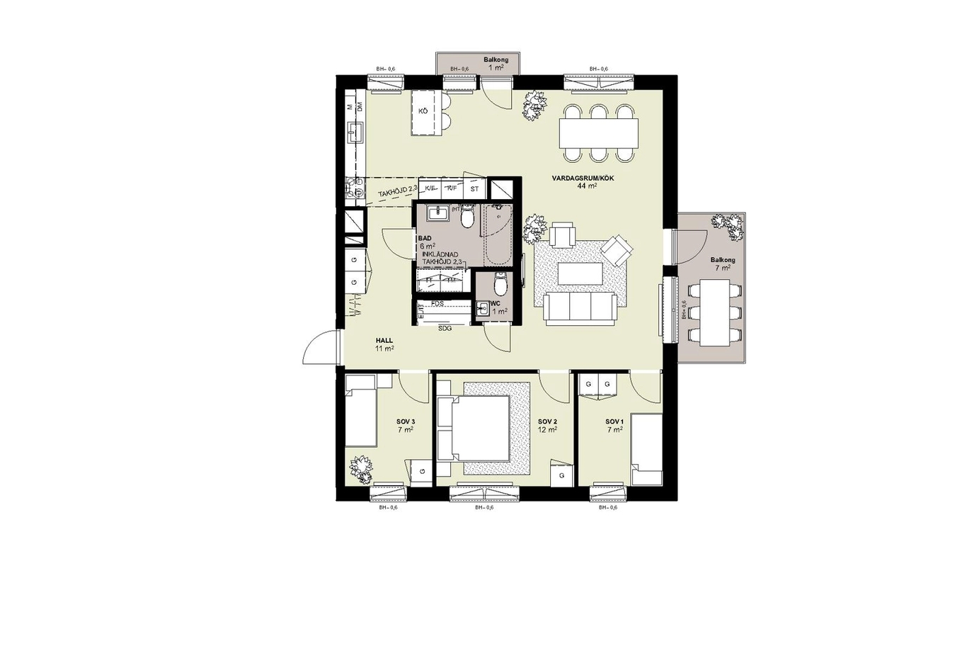 - Rundgående planlösning med 44 kvm sociala ytor