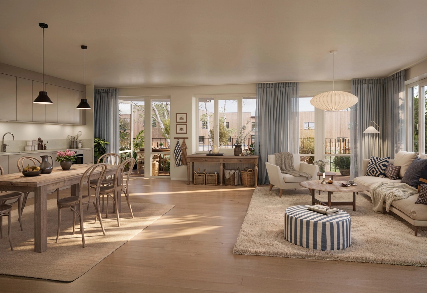Radhusen erbjuder det marknära boendet som många barnfamiljer längtar efter – med plats för både vardag och gemenskap. Här bor du på två eller tre plan, med mysig kamin i husets hjärta och njuter av havsbrisen på såväl terrass som på uteplatsen. Hemmen har premiumval i både kök och badrum och är utformade för att ge frihet att fokusera på det som verkligen betyder något – gemenskapen, barnen och vardagen – medan föreningen tar hand om det tunga och oväntade. Du slipper tänka på tak, fasader och stora underhållsprojekt, men får ändå känslan av eget hus med trädgård.