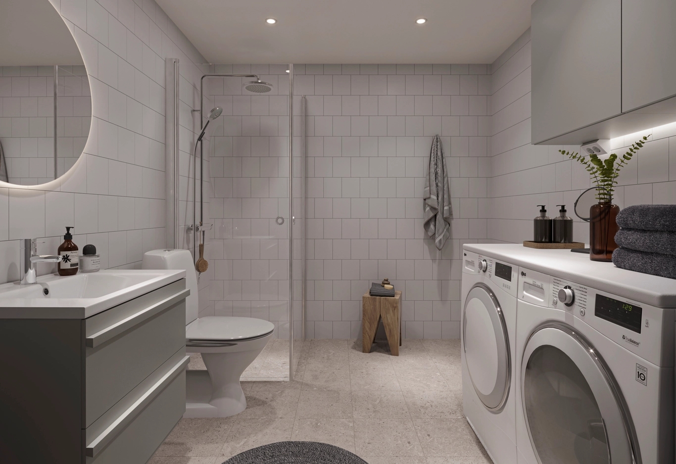 I parhusen får du ett välplanerat hem i två plan där de sociala ytorna i kök och vardagsrum ryms på entréplan och de privata sovrummen ligger lite mer avskilt en trappa upp. Köken har en stilren och tidlös inredning med kvalitativa material, ljusa skåpluckor och tåliga kompositstenbänkskivor som klarar både vardagsmatlagning och långmiddagar. Badrummen är omsorgsfullt utformade med kakel, klinker, takdusch och badkar som ger en ombonad känsla och skön vardagslyx. Alla parhus får egen uteplats med plats för både avkoppling och lekar.