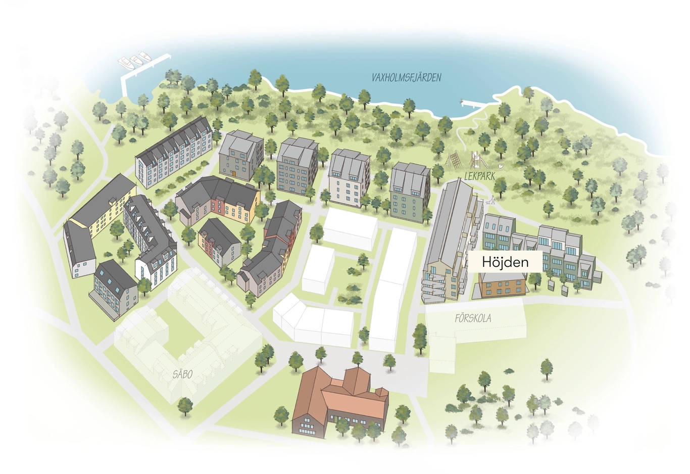 I Höjden, såväl som i Norrberget i stort, möts gemenskap och avskildhet i en grön och trivsam miljö. Lummiga gårdar, terrasser med utsikt över Vaxholmsfjärden, lekplats och gångvägar binder samman naturen i norr med stadens puls i söder.
