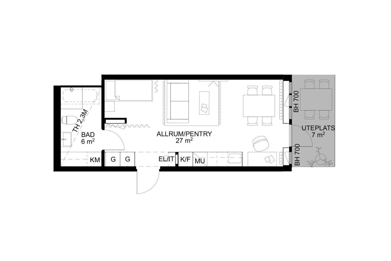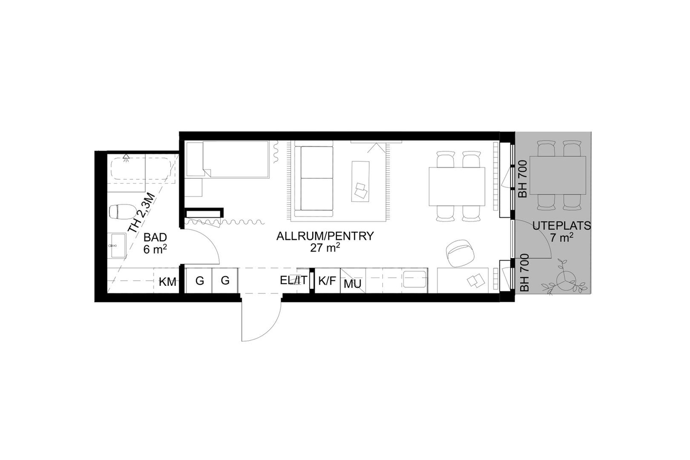 En etta med många funktioner och egen uteplats. Den här ettan är yteffektiv och rymmer både mindre soffgrupp, matbord, arbetshörna och sängplats. Badrummet är väl tilltaget och här kan du välja om du vill ha dusch eller badkar. Från matplatsen är det stora fönsterpartier mot uteplatsen som släpper in ljus. Uteplatsen mot gården har plats för utebord och stolar för trevliga stunder i solen.