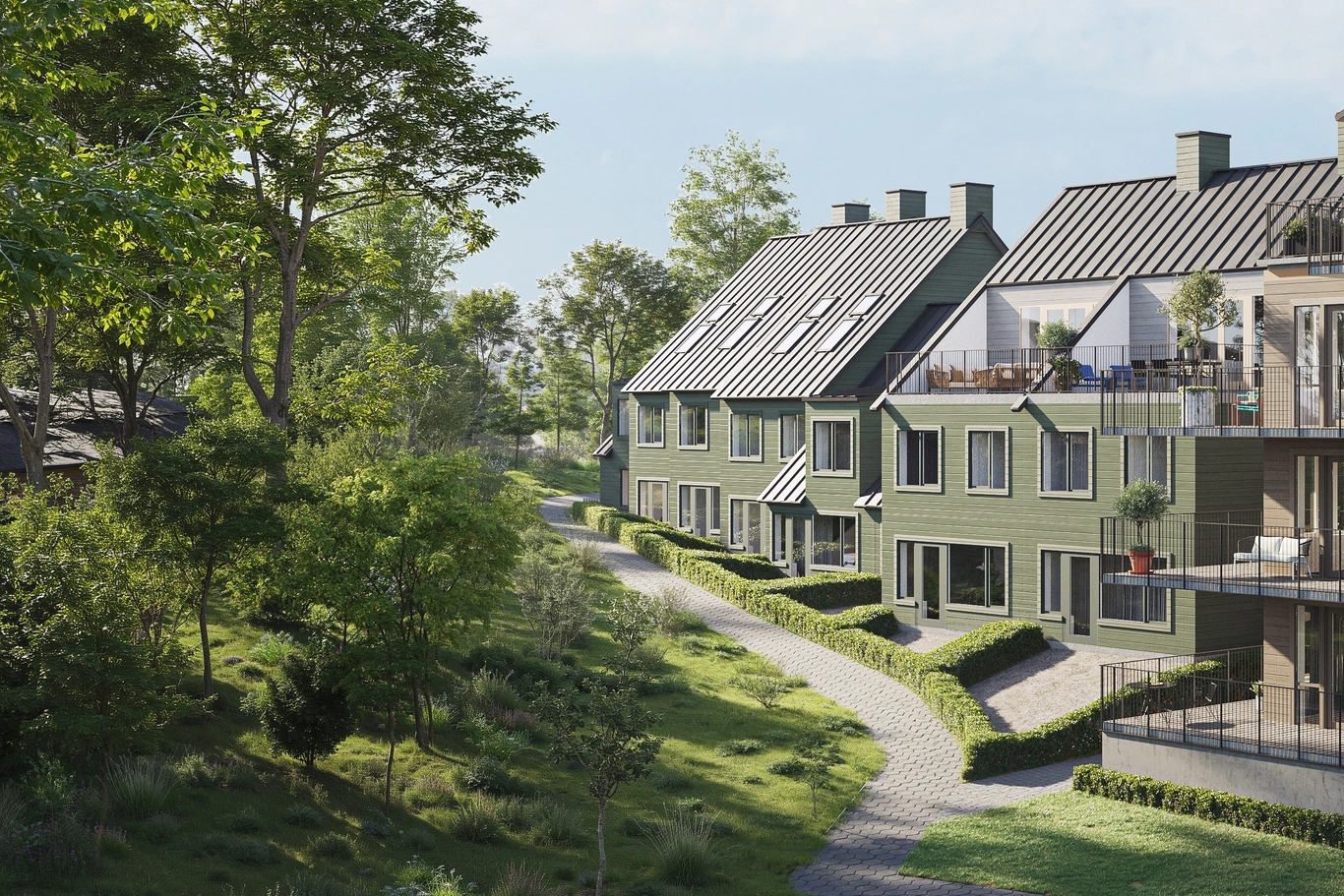 Radhusens träfasader i grönt och bruten vit med rumsbreda takkupor ger husen både karaktär och harmonisering till omgivningen. Inne väntar en välplanerad familjevänlig miljö där kaminen i vardagsrummet blir det naturliga hjärtat i hemmet.