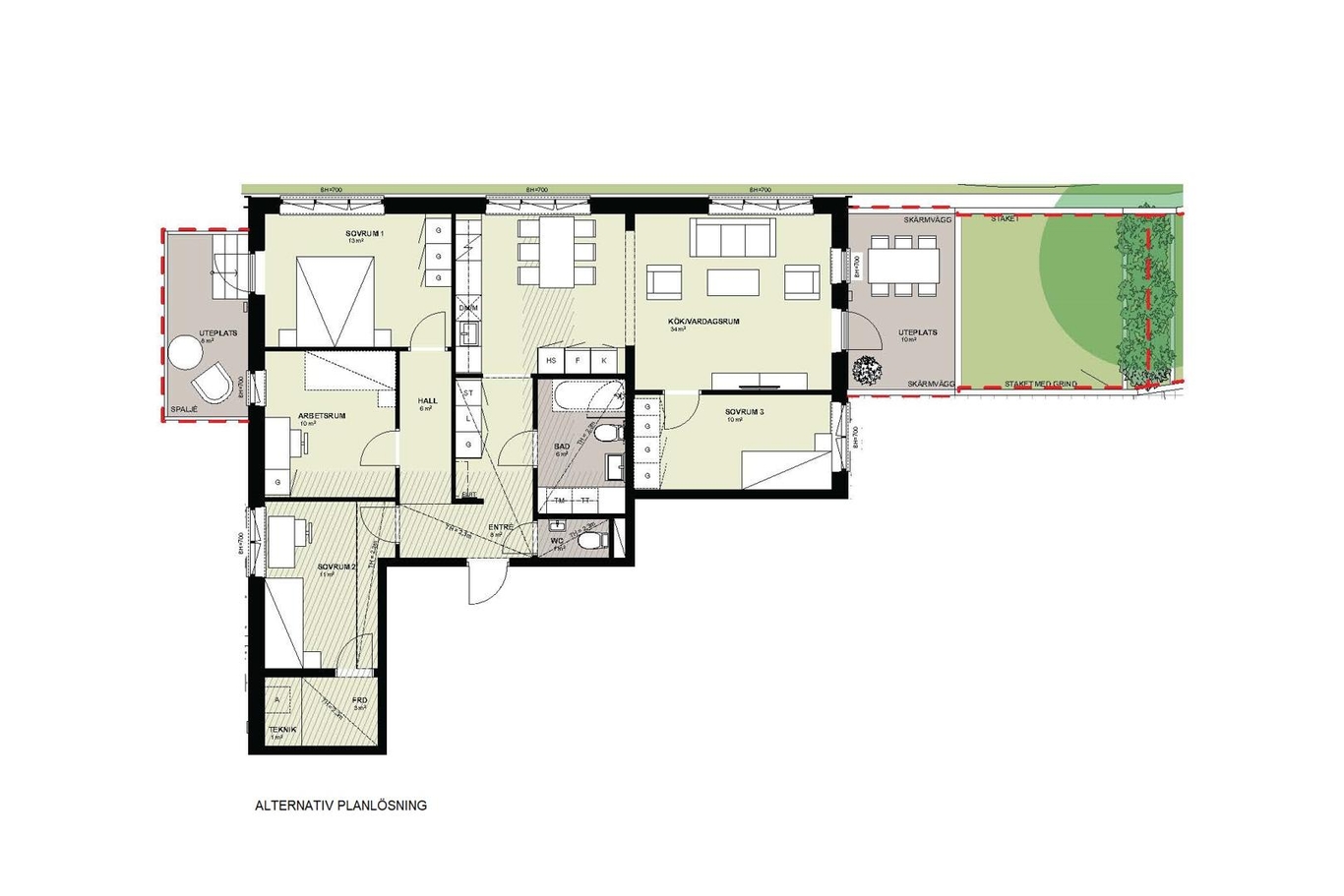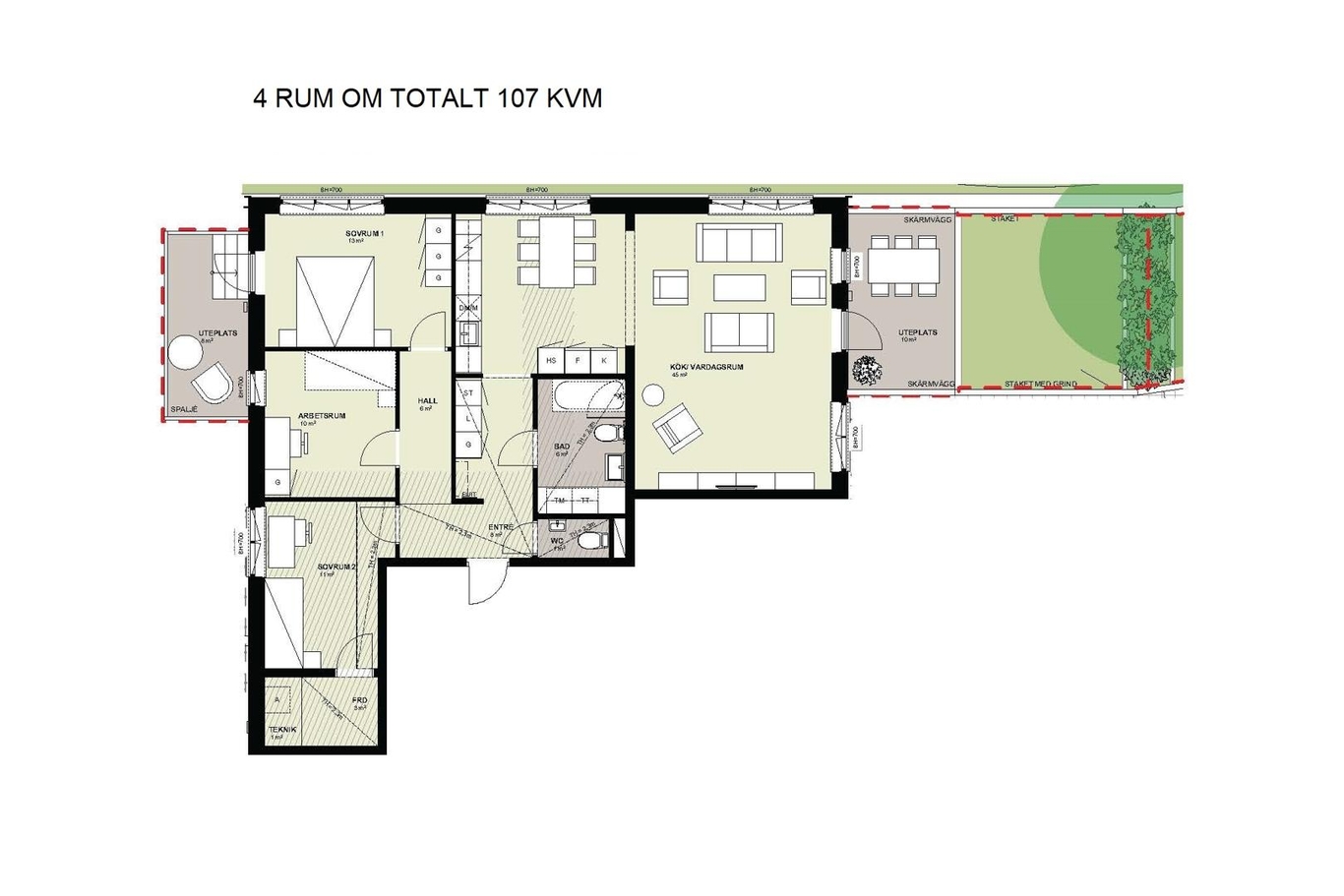 Flexibel lägenhet fördelade på 73 kvm boarea och 34 kvm biarea - totalt 107 kvm. Lägenheten har två uteplatser, varav den ena med egen grästäppa.