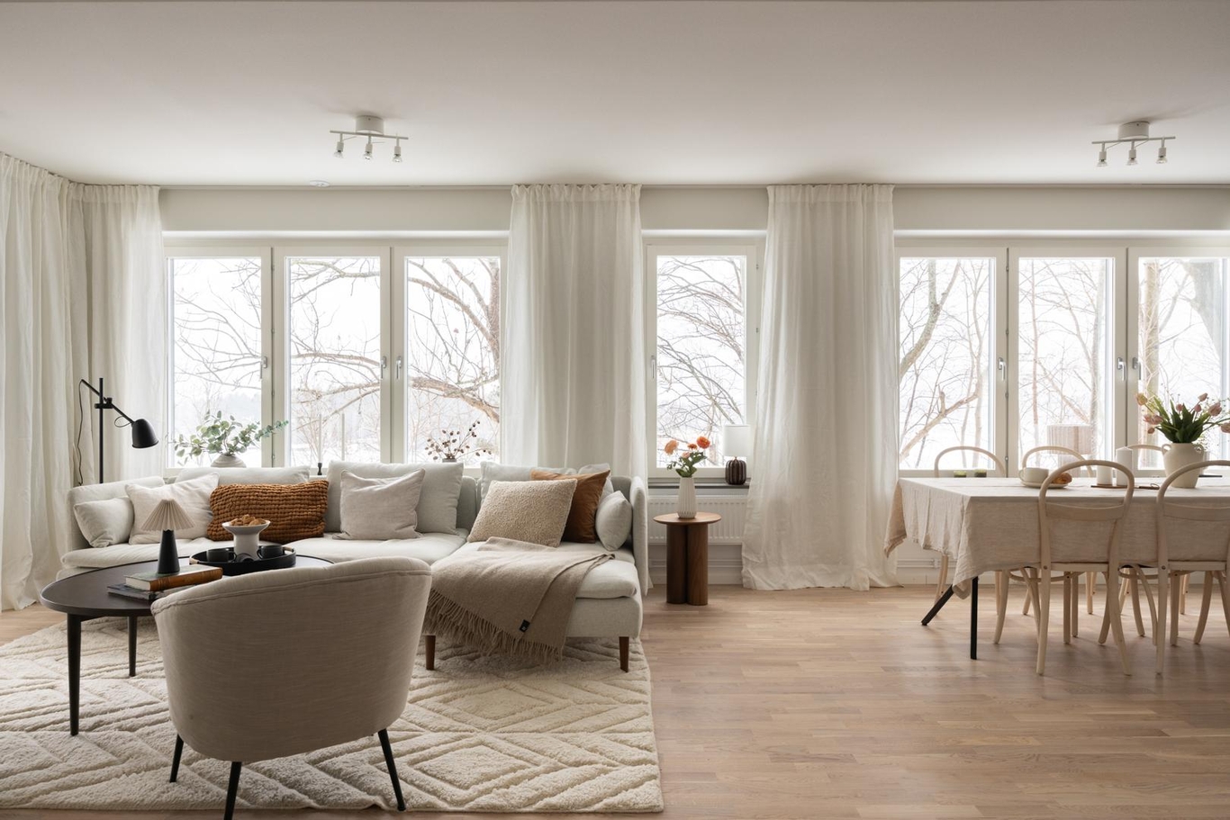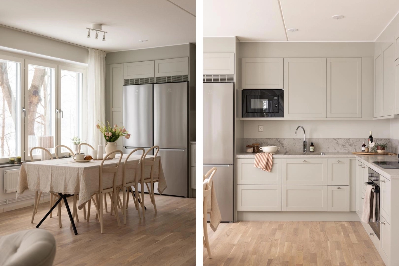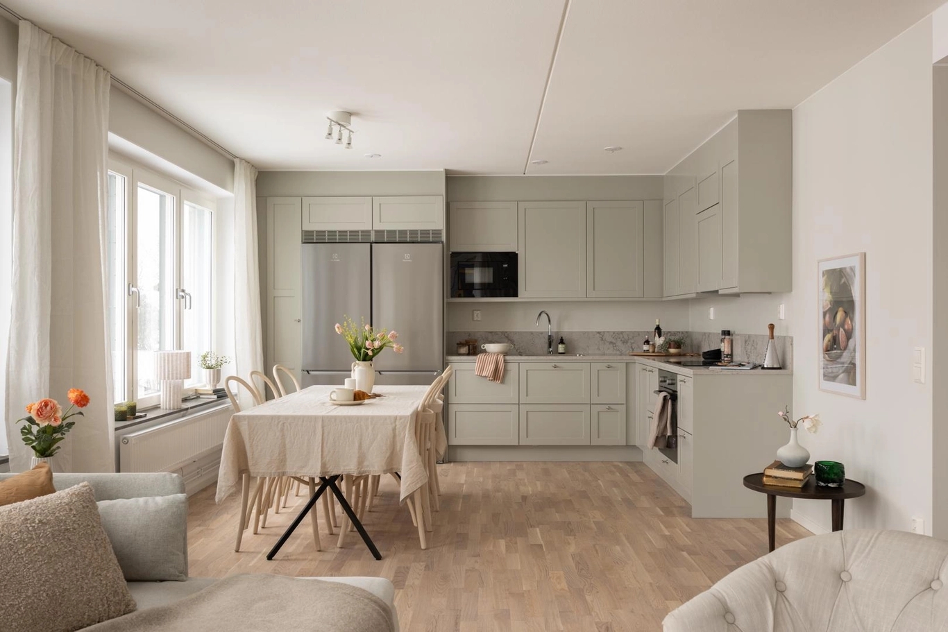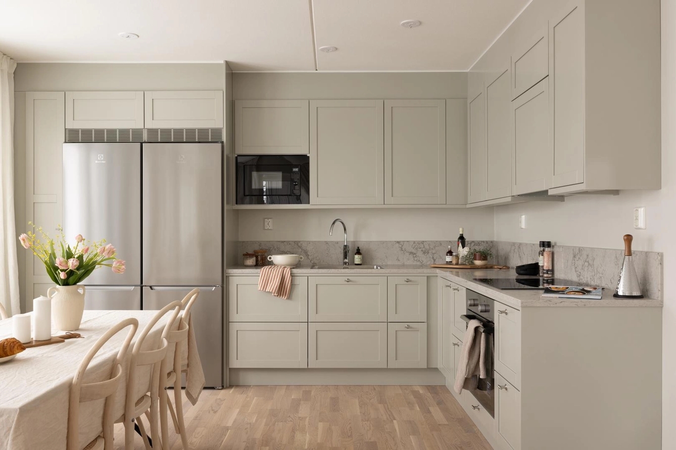 Här är inte bara utsikten något alldeles extra utan även materialvalen. Materialval, färger och design är omsorgsfullt framtagna för att bejaka känslan av luft, rymd och hav. Kökets form och design är klassisk, med stilrena ramluckor för ett ombonat, men samtidigt genomtänkt uttryck. Bänkskivan i sten harmoniserar med luckornas varmgrå färg ackompanjerad av en lägre list för att bevara känslan av rumslighet. Vitvarorna är rostfria och diskmaskinen integrerad bakom en kökslucka. Köket är från Vedum och vitvarorna från Electrolux med matchande kvalitetsblandaren Mmix från Mora. I badrummen finns plats för vila och återhämtning, som det varmgrå kaklet varsamt reflekterar. Linnebeige lucka med ram för ett klassiskt och möblerat intryck adderar till mysfaktorn.