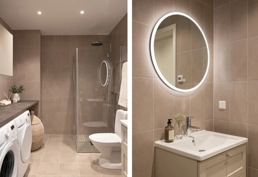 I badrummen finns plats för vila och återhämtning, som det varmgrå kaklet varsamt reflekterar. Linnebeige lucka med ram för ett klassiskt och möblerat intryck adderar till mysfaktorn.