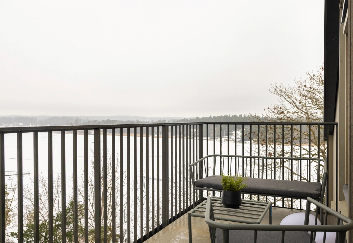 Här är inte bara utsikten något alldelles extra utan även materialvalen. Materialval, färger och design är omsorgsfullt framtagna för att bejaka känslan av luft, rymd och hav. Kökets form och design är klassisk, med stilrena ramluckor för ett ombonat, men samtidigt genomtänkt uttryck.