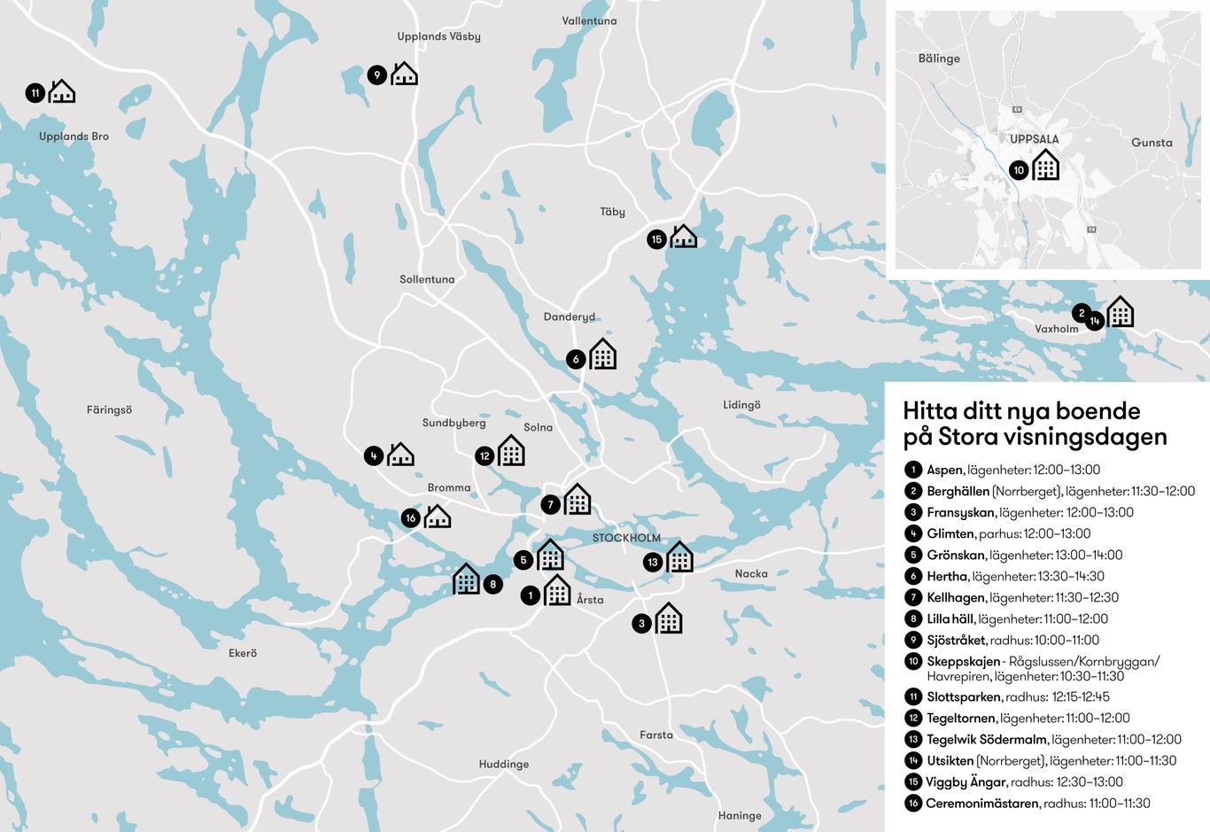 Nedan listas aktuella projekt som visas på Stora visningsdagen den 9 november. Klicka på visningstiderna för att komma till respektive projektsida där du kan läsa mer om bostäderna och göra en intresseamälan.