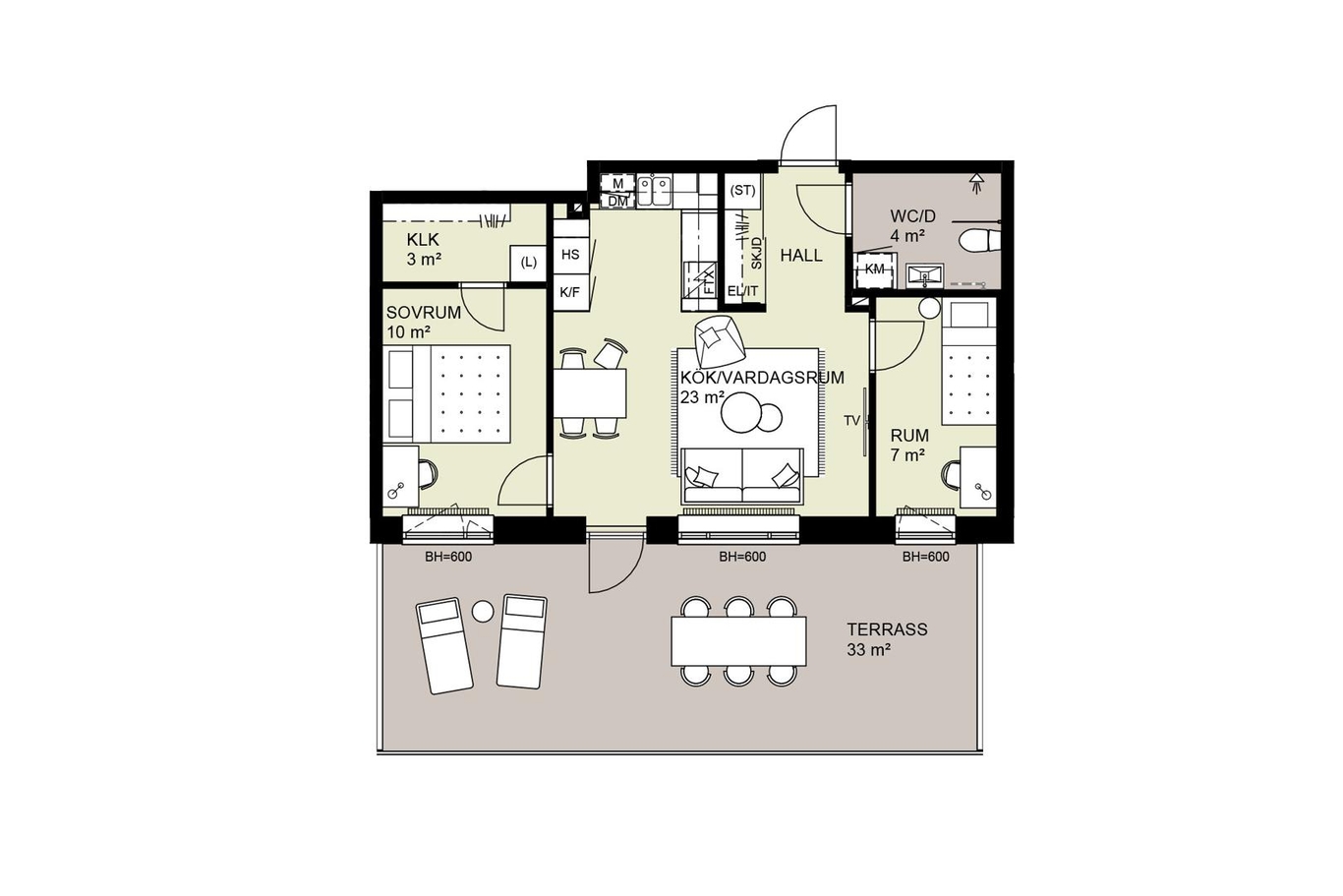 Denna 3:a om 55 kvm har en stor terrass som sommartid blir en förlängning av vardagsrummet. Vardagsrum och kök har en öppen planlösning där det U-formade köket lämnar plats att möblera med både soffa och matgrupp i rummet. Två sovrum, varav ett med klädkammare.